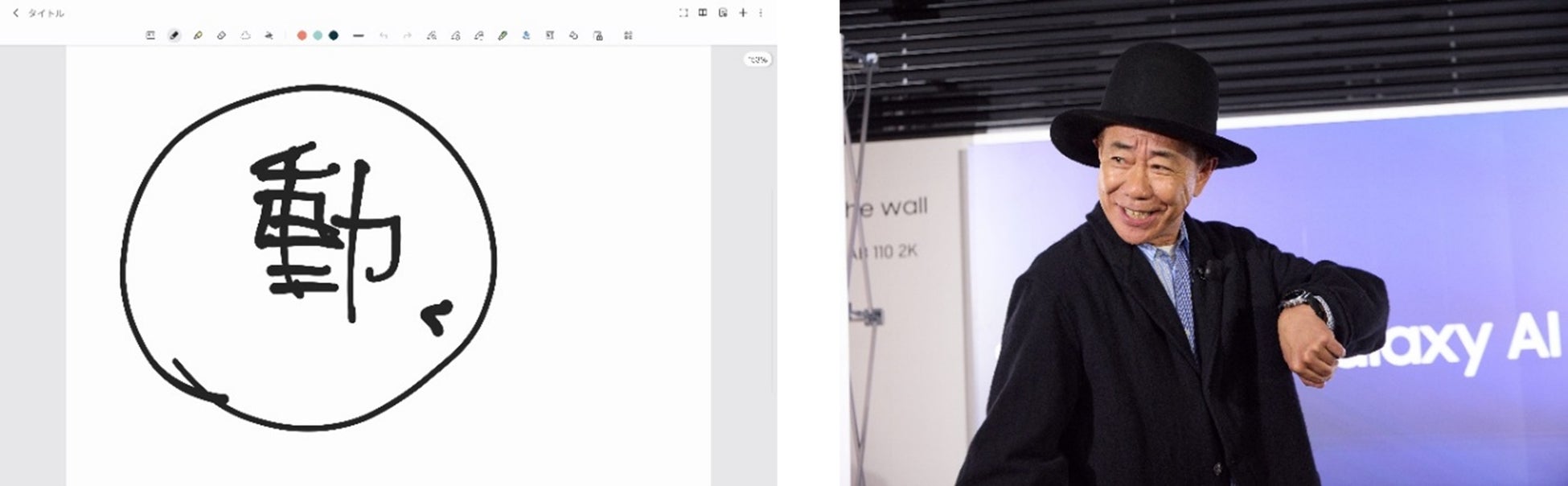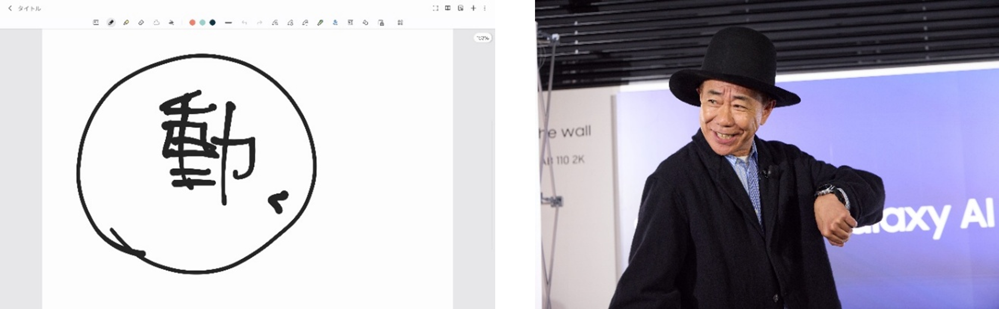 イベント当日は、Samsung Galaxyのリアルユーザーである木梨憲武さんがゲストに登場。Galaxy AIのスケッチアシスト機能「AIスケッチ」を使ったアート制作や、Gemini Liveを使って作詞した楽曲制作とCM撮影の舞台裏を語っていただき、Samsung Galaxyの端末を利用して誰もが簡単にアートや音楽を楽しめることを伝授していただきました。