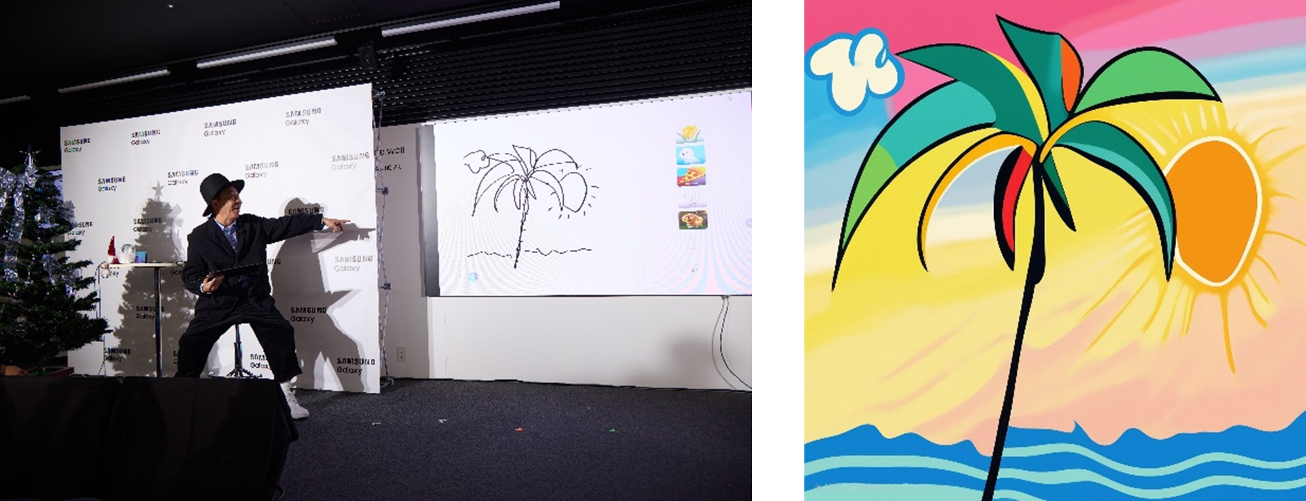 招待客から事前に募集したテーマの中からランダムに選ばれたお題に沿って、Samsung Galaxyを使用した即興アート制作に挑戦するアートワークショップ体験が行われました。木梨さんがその場で描き上げたスケッチにGalaxy AIのスケッチアシスト機能「AIスケッチ」を活用することで、簡単かつ表現豊かなアート作品へと仕上がりました。