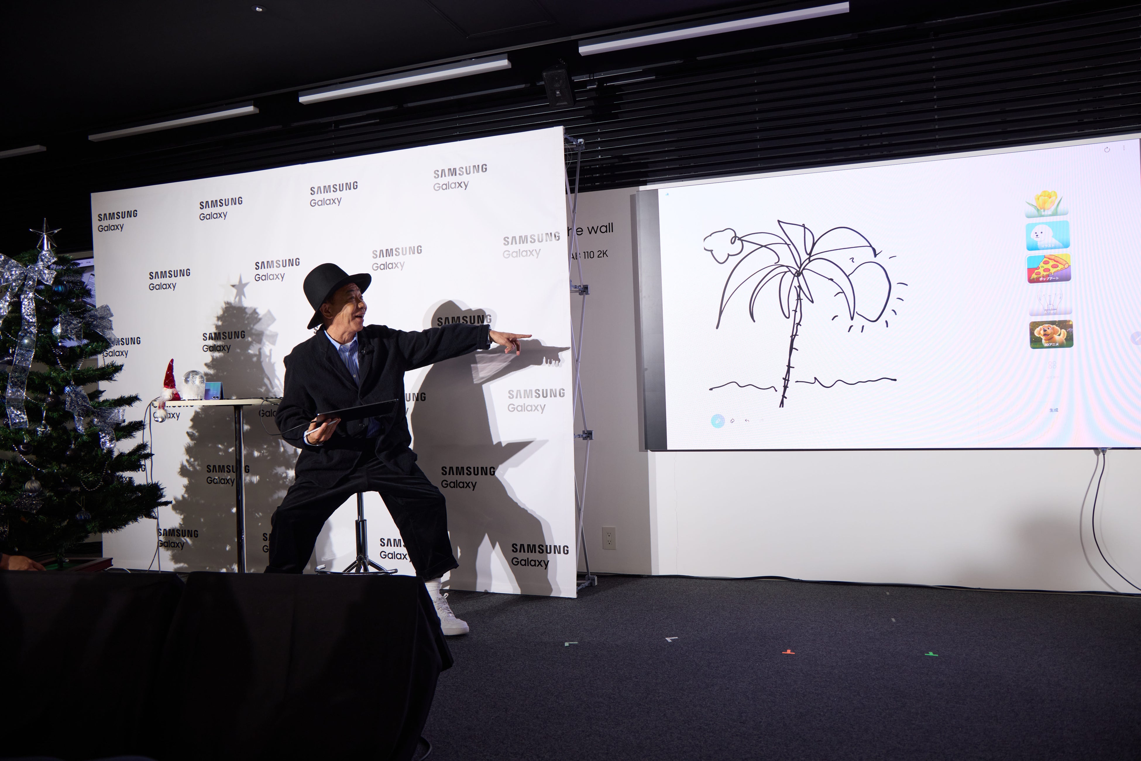 Galaxy AIの「AIスケッチ」機能を使った即興アート制作体験で「ノリサンタ」をスケッチ 招待客との「手のひらシャッター」を活用した撮影会や、木梨サンタクロースからのサプライズプレゼントも