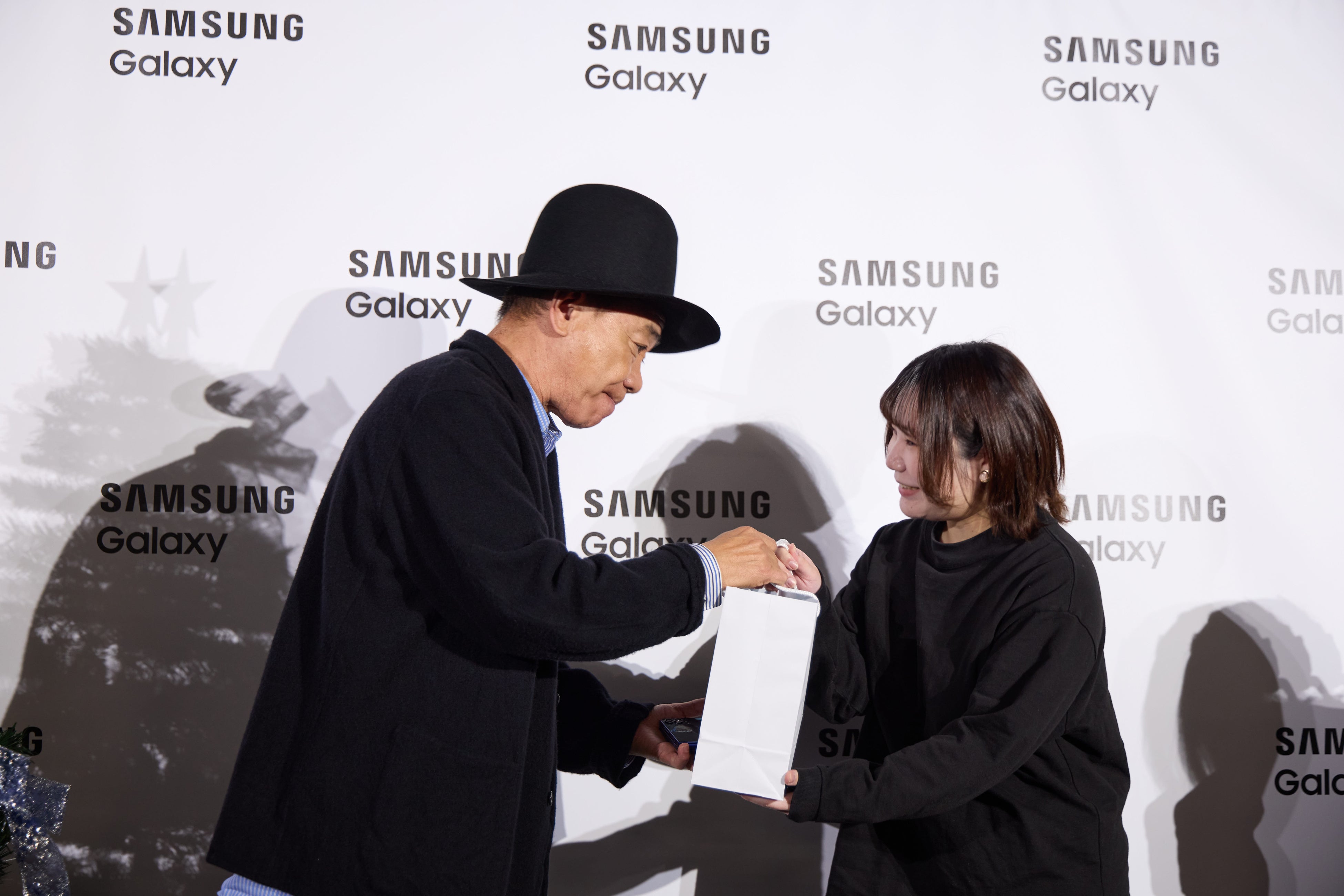 トークセッション後、木梨さんが再登場。Samsung Galaxyならではの「手のひらシャッター」を使ったフォトセッションが行われ、会場のお客様と一緒に笑顔溢れるひとときを楽しみ、撮影した写真はQuick Shareを使用してお客様に共有されました。さらにフォトセッション後には、木梨さんから、来場者にクリスマスプレゼントがサプライズで手渡され、会場は温かな歓声に包まれました。