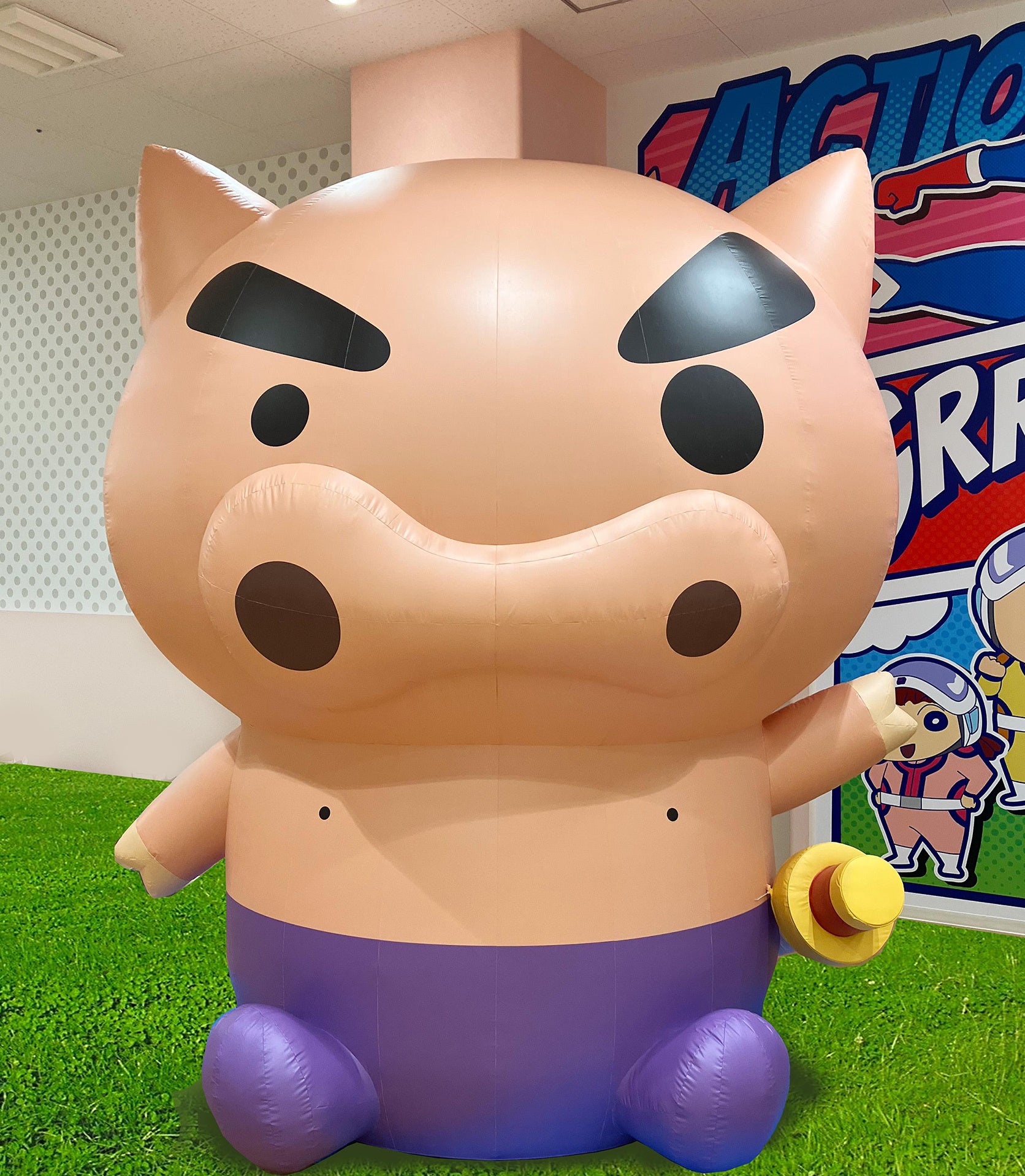 | しんちゃんのおしりをモチーフとした大型のトランポリンです。 お子さまが体を使い、おもいっきり飛び跳ねて遊べます。 |