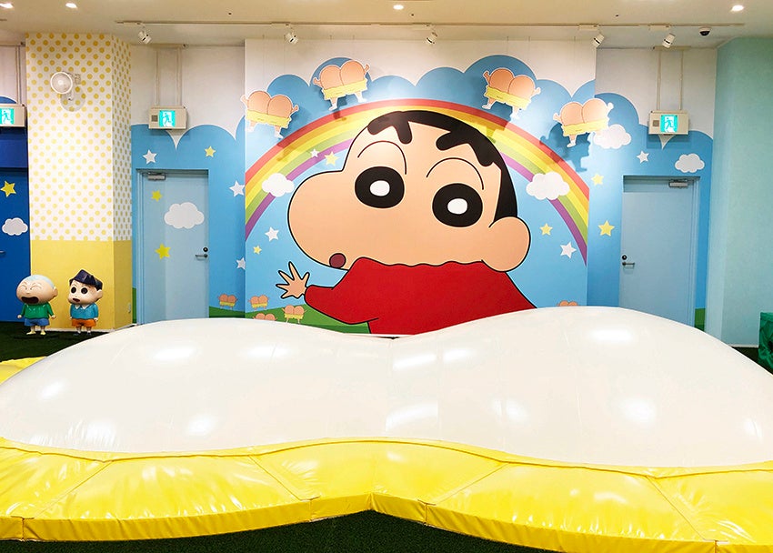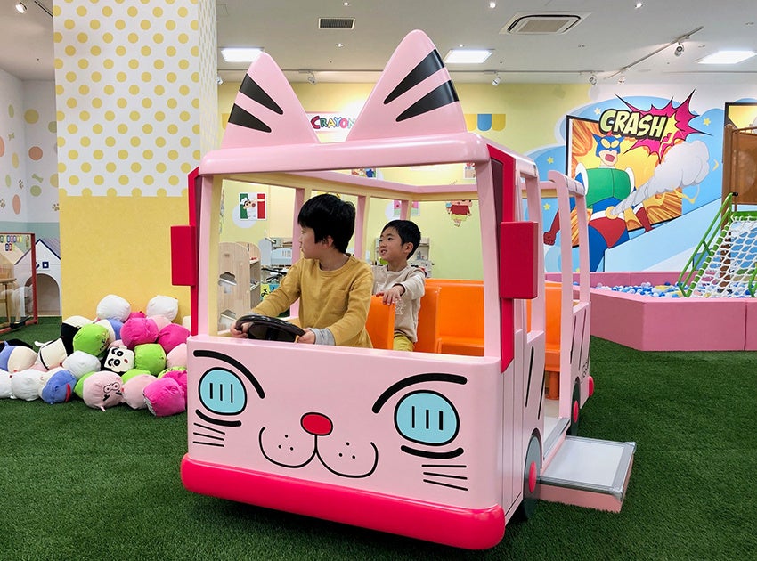 | 施設内にはふたば幼稚園の通園バス、園服を着たしんちゃん、壁にはたくさんのキャラクターと写真スポットも盛りだくさん。 |