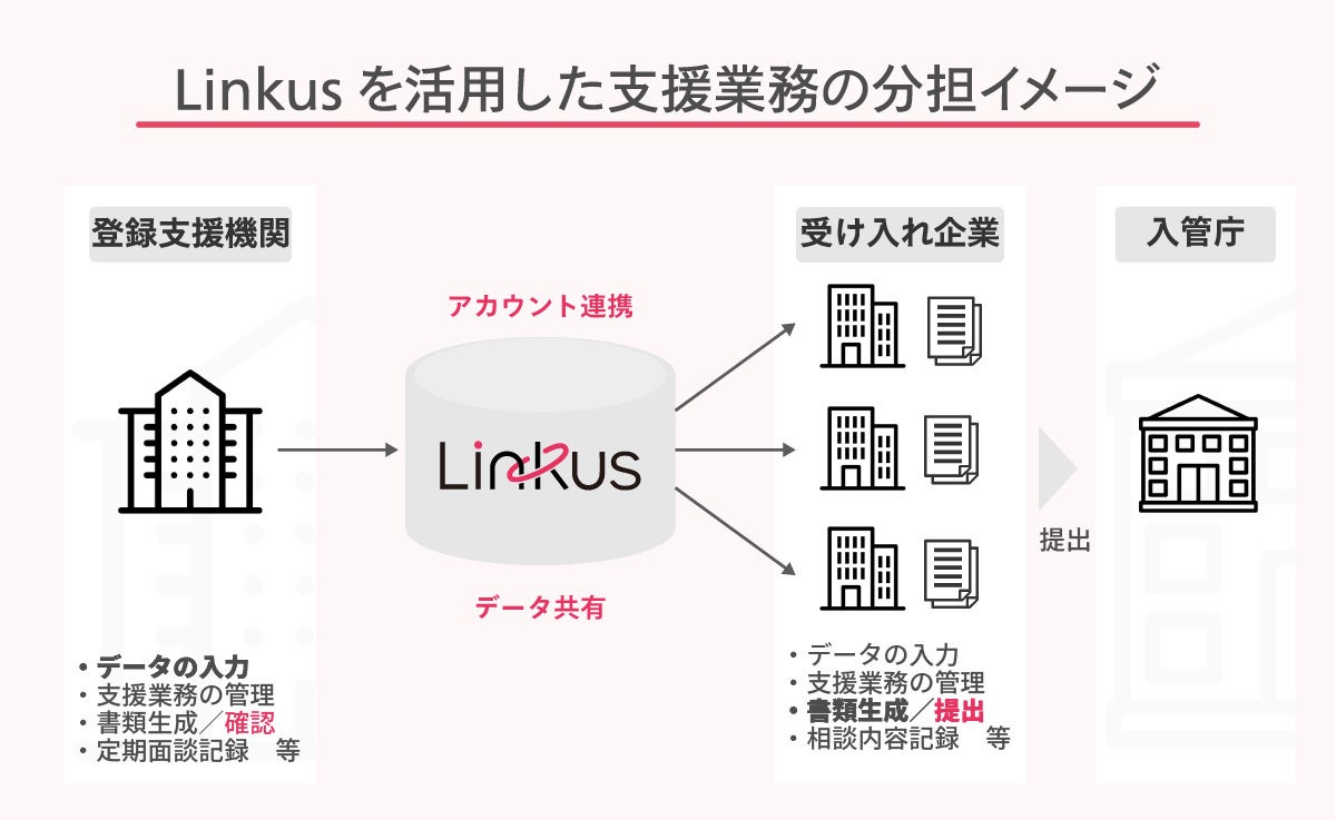 特定技能の支援業務管理システム「Linkus(リンクス)」は、登録支援機関、受け入れ企業、送り出し機関といった特定技能に関わる企業・団体がアカウントを共有し、特定技能外国人の情報や手続き書類データ等を共有できる機能を有しています。