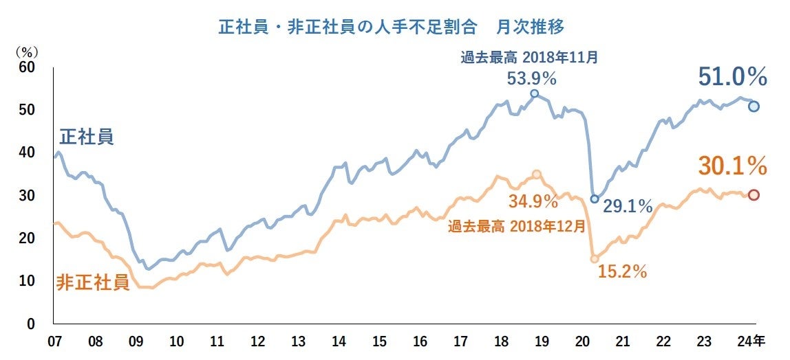 1. 人手不足割合は正社員で51.0%と高止まり、非正社員でも同様の傾向