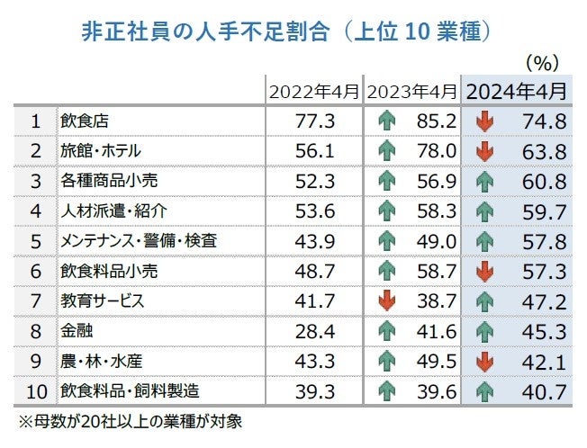 深刻な人手不足がみられる「旅館・ホテル」「飲食店」は、それぞれピークだった2023年時点から低下に転じた。特に非正社員における従業員数が増加した割合が高い