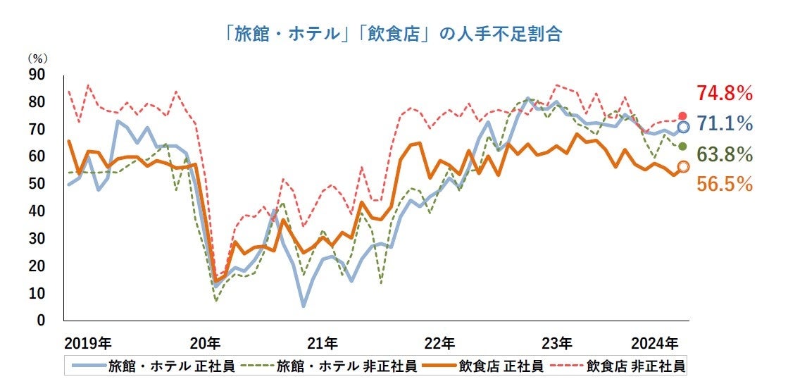 そうしたなか、「旅館・ホテル」は正社員において71.1%の企業が人手不足となり、深刻な状況が続いている一方で、8割に迫る水準まで上昇していた人手不足割合は2023年と比較して低下しており、2024年以降は7割前後で推移している。引き続き他業種と比較して高水準であることに変わりはないが、低下傾向に転じた。