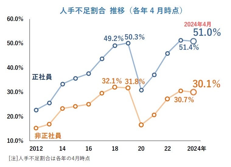 2024年4月時点における全業種の従業員の過不足状況について、正社員が「不足」と感じている企業の割合は51.0%だった。毎年4月は新卒新入社員が入社することで人手不足が緩和される傾向があるが、前年同月比でもわずか0.4ポイントの低下にとどまり、高止まりが続いている。