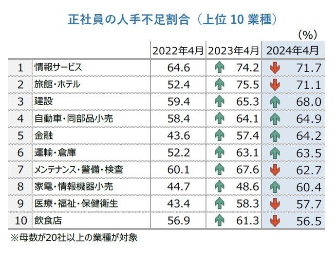 また、活況なインバウンド需要がみられるなかで「旅館・ホテル」も71.1%で深刻な人手不足がみられる。その他、「建設」(68.0%)、「自動車・同部品小売」(64.9%)など6業種が6割台となった。