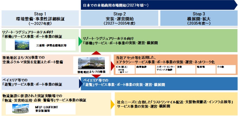・築地地区まちづくり事業や三重県・伊勢志摩地区をはじめ、具体プロジェクトでの空のモビリティ用離着陸場であるバーティポート開発、ならびに運営事業の立ち上げに着手。今後、幅広いアセットでの実装を検討。 ・トヨタ自動車株式会社、朝日航洋株式会社(※2)、ANAホールディングス株式会社と連携し、空のモビリティ産業の創造・発展を加速。 |