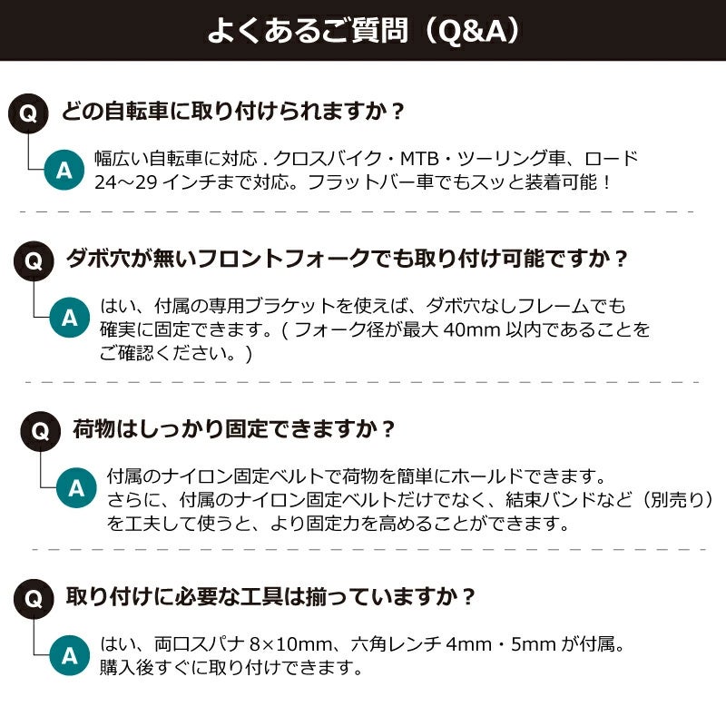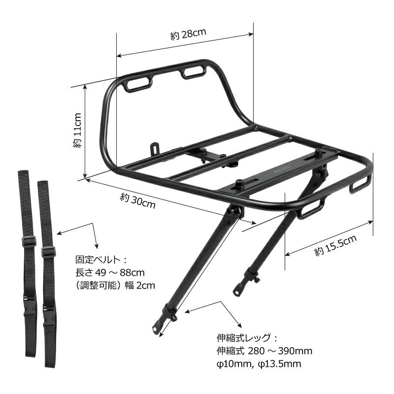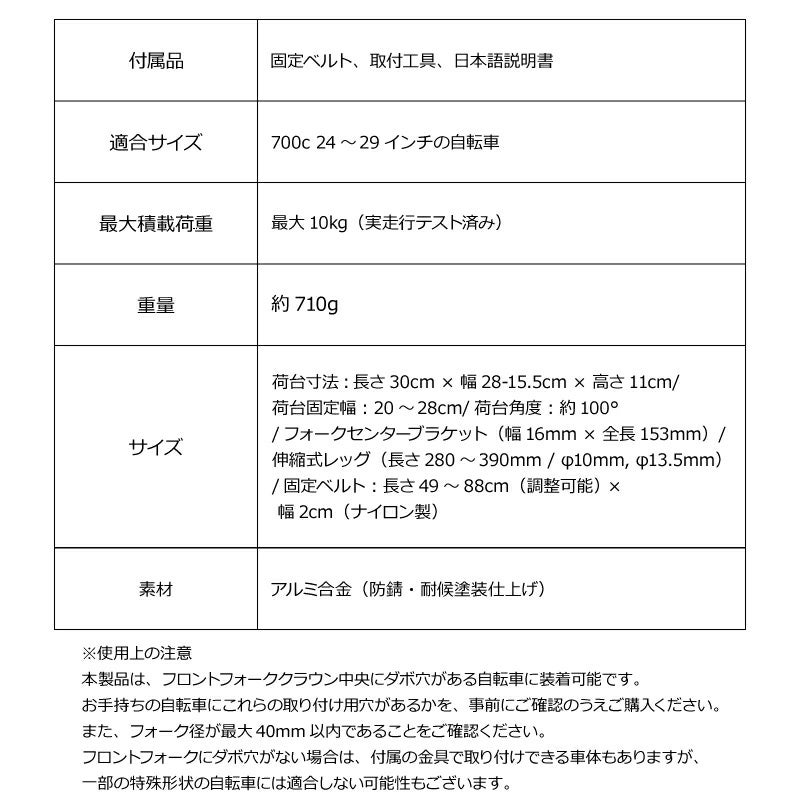 荷台寸法:長さ30cm × 幅28-15.5cm × 高さ11cm/荷台固定幅:20~28cm/荷台角度:約100° /フォークセンターブラケット(幅16mm × 全長153mm)/伸縮式レッグ(長さ280~390mm / φ10mm, φ13.5mm)/ 固定ベルト:長さ49~88cm(調整可能) × 幅2cm(ナイロン製) |