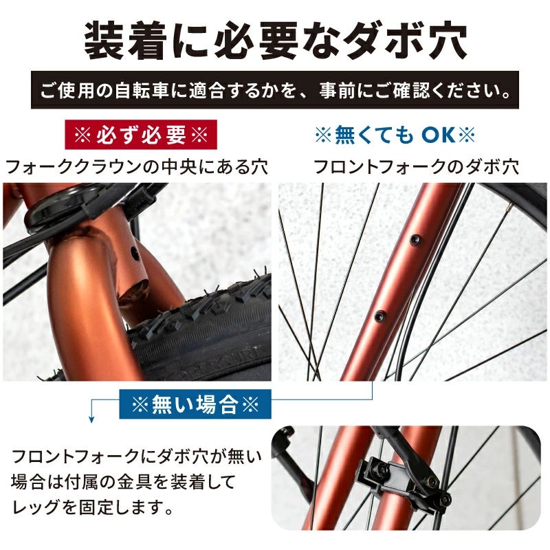 本製品は、フロントフォーククラウン中央にダボ穴がある自転車に装着可能です。 お手持ちの自転車にこれらの取り付け用穴があるかを、事前にご確認のうえご購入ください。 また、フォーク径が最大40mm以内であることをご確認ください。 フロントフォークにダボ穴がない場合は、付属の金具で取り付けできる車体もありますが、 一部の特殊形状の自転車には適合しない可能性もございます。 |