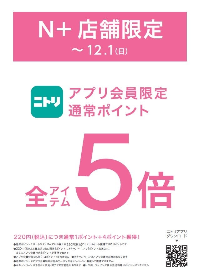 【ニトリのアパレルブランドN+】ニトリアプリ会員限定通常ポイント5倍キャンペーンをN+全国47店舗にて開催!