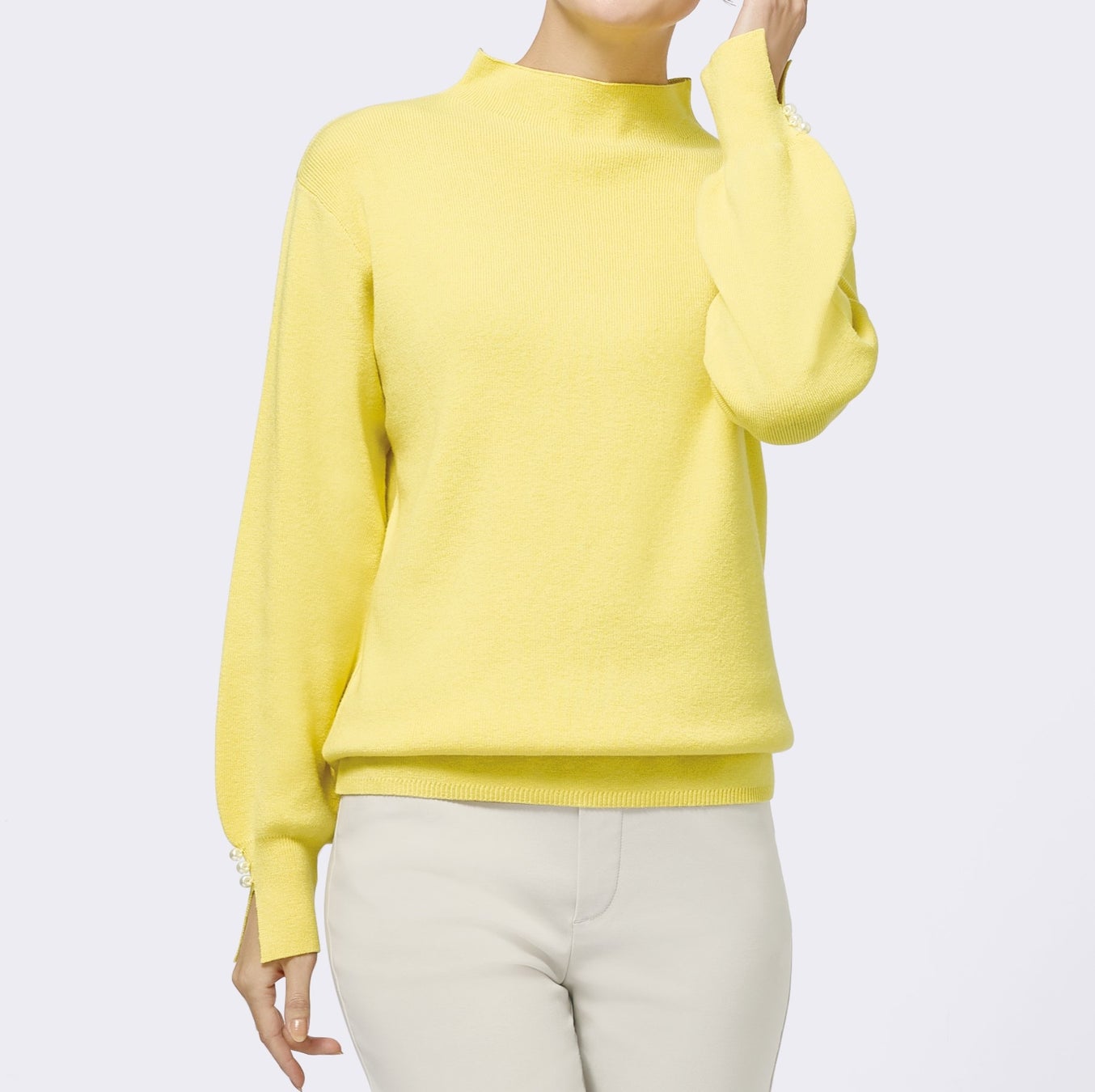 袖口のスリットと3連のプラパールがポイントのニット。首元は程よい開き感のボトルネックで、小顔見え効果も。吸湿発熱機能付きであたたかく着られます。