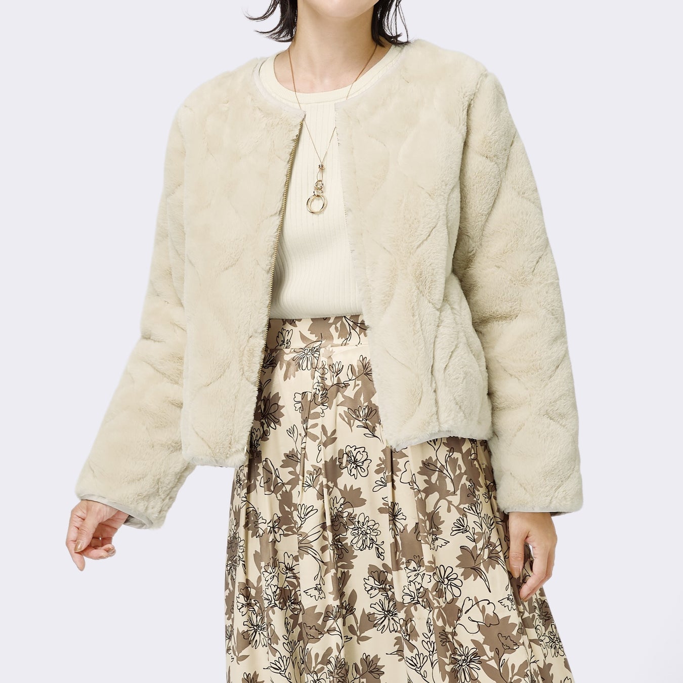 ボリュームたっぷりのフェイクファーは、ふんわり優しいタッチであたたか。リバーシブルにすると、カジュアルな印象に変わります。ショート丈なので、合わせるボトムスを選びません。