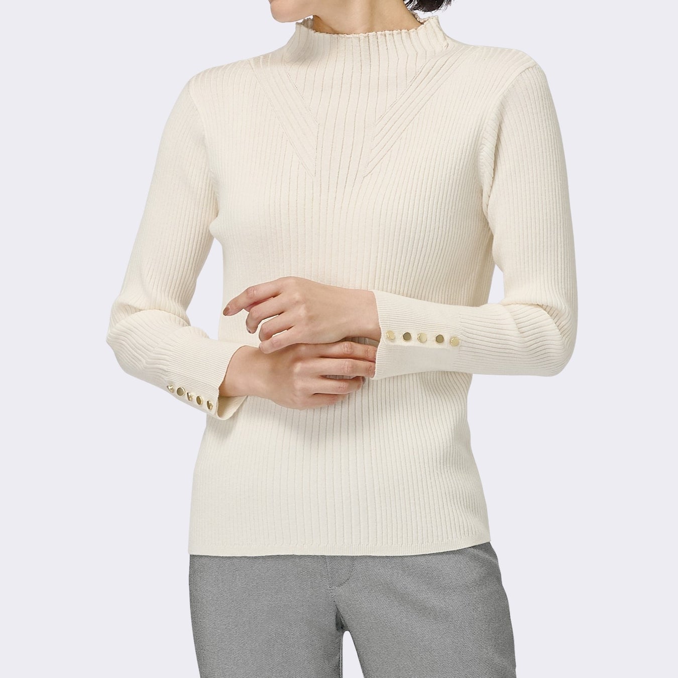 胸元のリブの切替えデザインが利いたニット。ジャケットのインにも使用できるコンパクトなシルエットで、袖口のメタル調ボタンが高見えします。吸湿発熱機能付きであたたかいのもポイントです。