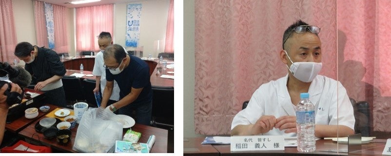 5月23日に開催した第1回の検討会では、生のムラサキウニの風味を損なわないよう添加物を使わずに急速冷凍した鳥取県産のムラサキウニを試食いただきました。素材と処理への評価や処理の方法について様々な提案があったほか、このムラサキウニを活かした各ジャンルで想定されるウニ料理について次々と意見や提案がなされ、皆さん、今後の展開にもとても前向きにとらえてくださいました。
