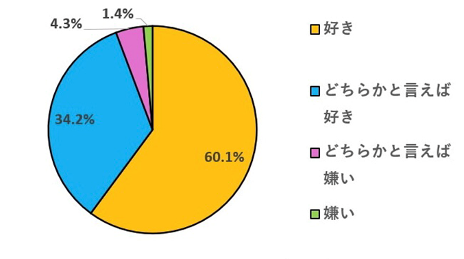 ヨーグルトが「好き」と回答した方が60.1%いらっしゃいます。過半数の方はヨーグルトが好きなようです。「どちらかと言えば好き」という方が34.2%いらっしゃいますので、合わせて94.3%の方がヨーグルトが好きなようです。