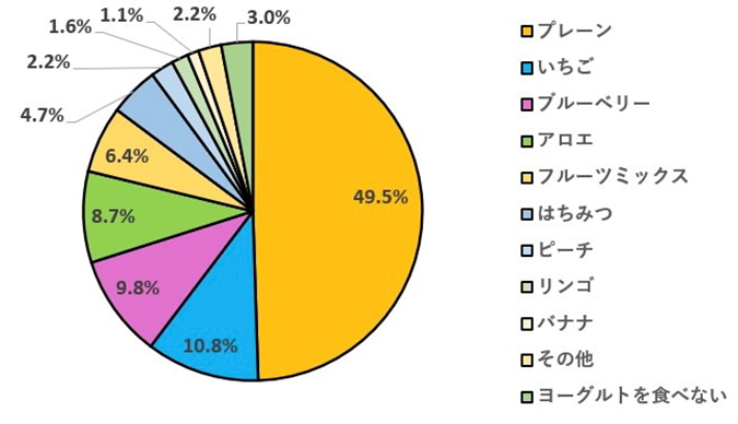 一番好まれているのは「プレーン」で49.5%となっています。続いて大きく下がって「いちご」が10.8%、「ブルーベリー」が9.8%、「アロエ」が8.7%となっています。プレーンヨーグルトを購入しておき、その日の気分でジャムなどで味を変えて食べることもできるので、基本的にはプレーンヨーグルトを冷蔵庫にストックしておくのがいいかもしれません。