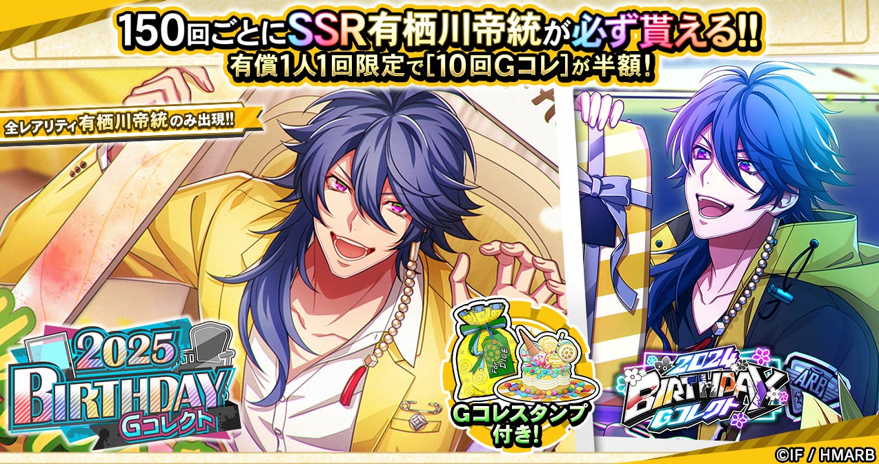帝統の誕生日を記念し、「SSR【バースデー2025】有栖川帝統」を獲得することができるGコレクトや、バースデー限定のデコステッカーが獲得できるイベントなどを開催しています。