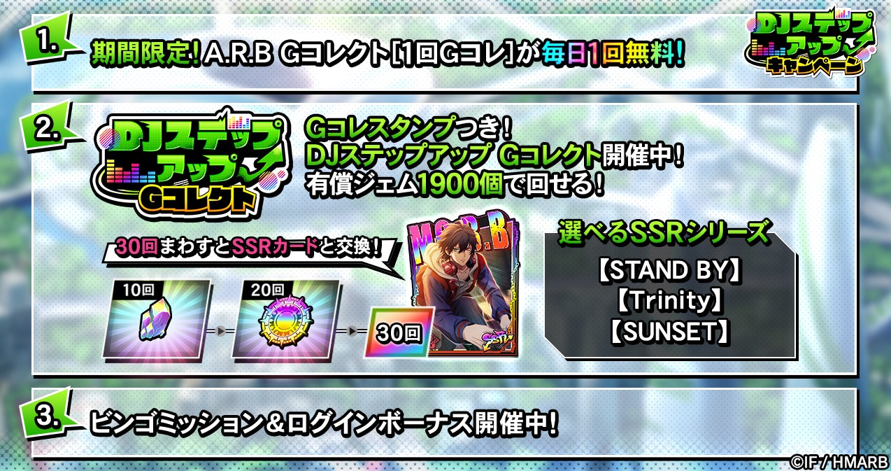 期間中A.R.B Gコレクトの[1回Gコレ]を1日1回、無料で回すことができるほかに、ビンゴミッションやログインボーナス、ライズ回復時間1/2キャンペーンなどを開催しています。詳細はアプリ内お知らせをご確認ください。