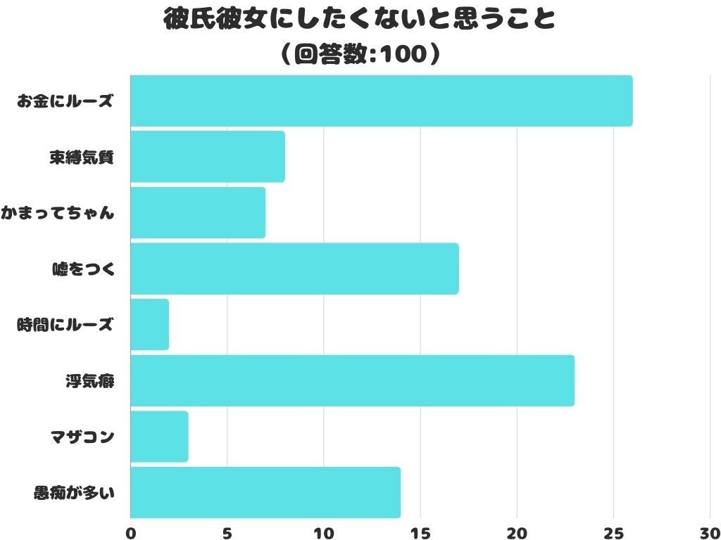 「彼氏彼女にしたくない」をアンケートにて調査したところ、1位は「お金にルーズ」でした。