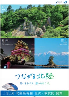 新幹線の延伸開業に伴う新しい輸送体系・運転時刻・価格等をお客様に確実にお伝えするため、開業1カ月前となる2月16日からは、駅・車内のポスター等に加えてTVCM放映や新聞・WEB出稿などにより告知を強化します。この取り組みの中では、北陸地方が新幹線で「つながる」ことから、「人の移動とともに人の想いもつながっていく」という意味を込め、「つながる北陸」というキーワードで展開します。
