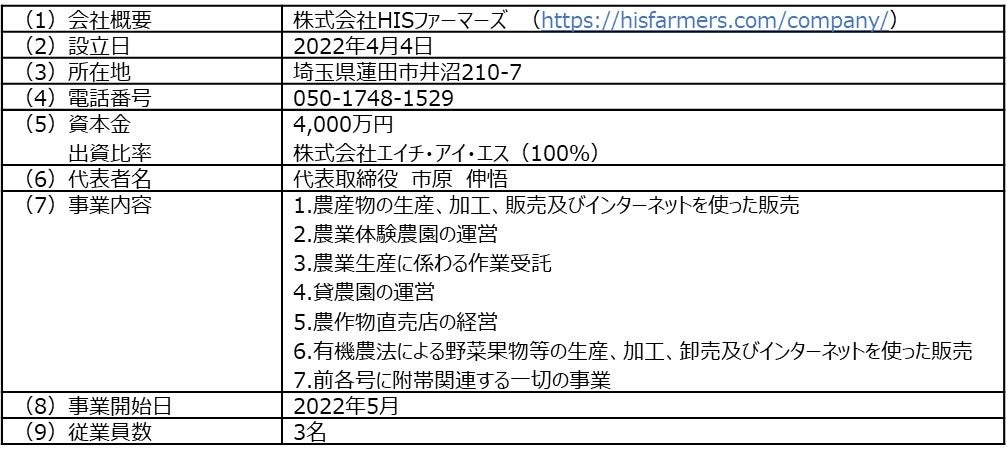 | (1)会社概要 | 株式会社HISファーマーズ (https://hisfarmers.com/company/) |