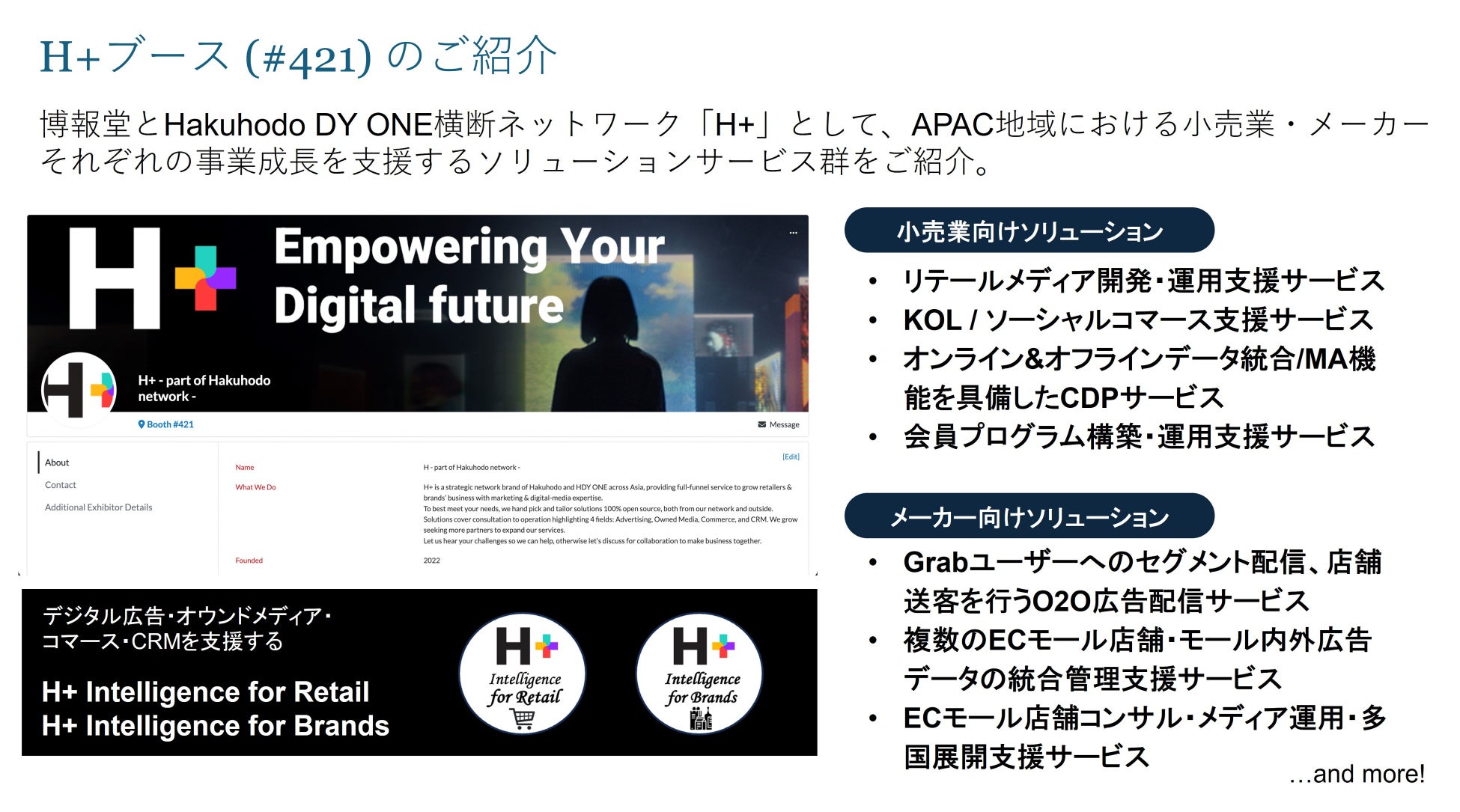 H+は、デジタル広告、オウンドメディア、コマース、CRMの4領域を通じてAPAC企業のフルファネル・マーケティングを支援し、事業成長に貢献することを目指しております。今回の出展では、小売企業・メーカー企業に向けたソリューション「H+ Intelligence for Retail」「H+ Intelligence for Brands」を紹介いたします。これらのソリューションは、小売企業を想定したリテールメディア開発/運用・会員プログラム構築/運用支援や、メーカー企業を想定したOnline to Offline広告・EC事業成長など、フルファネル・マーケティングの構想・実装・運用にまたがり、地域横断または国単位で支援を行うサービスをご提供いたします。