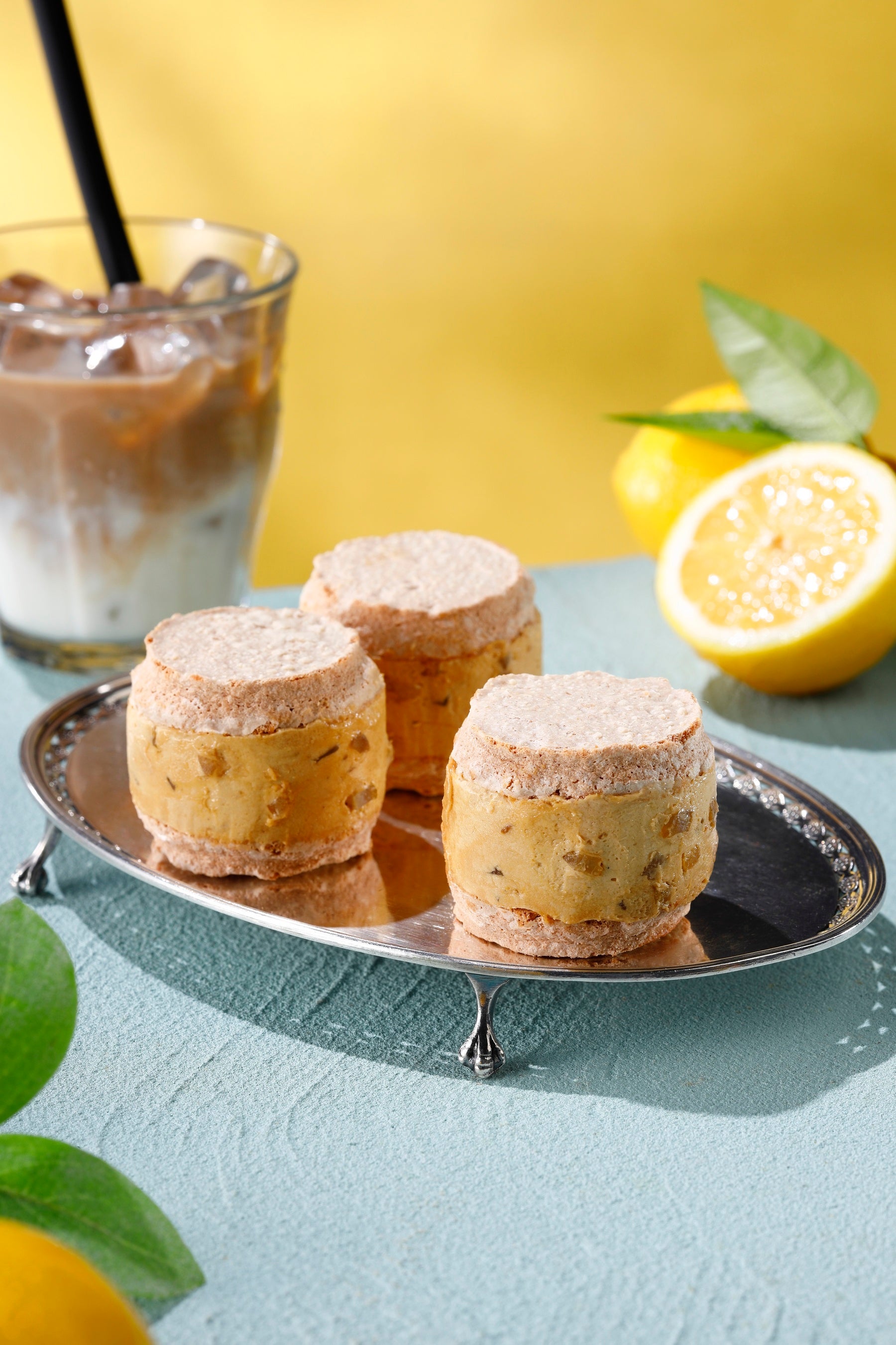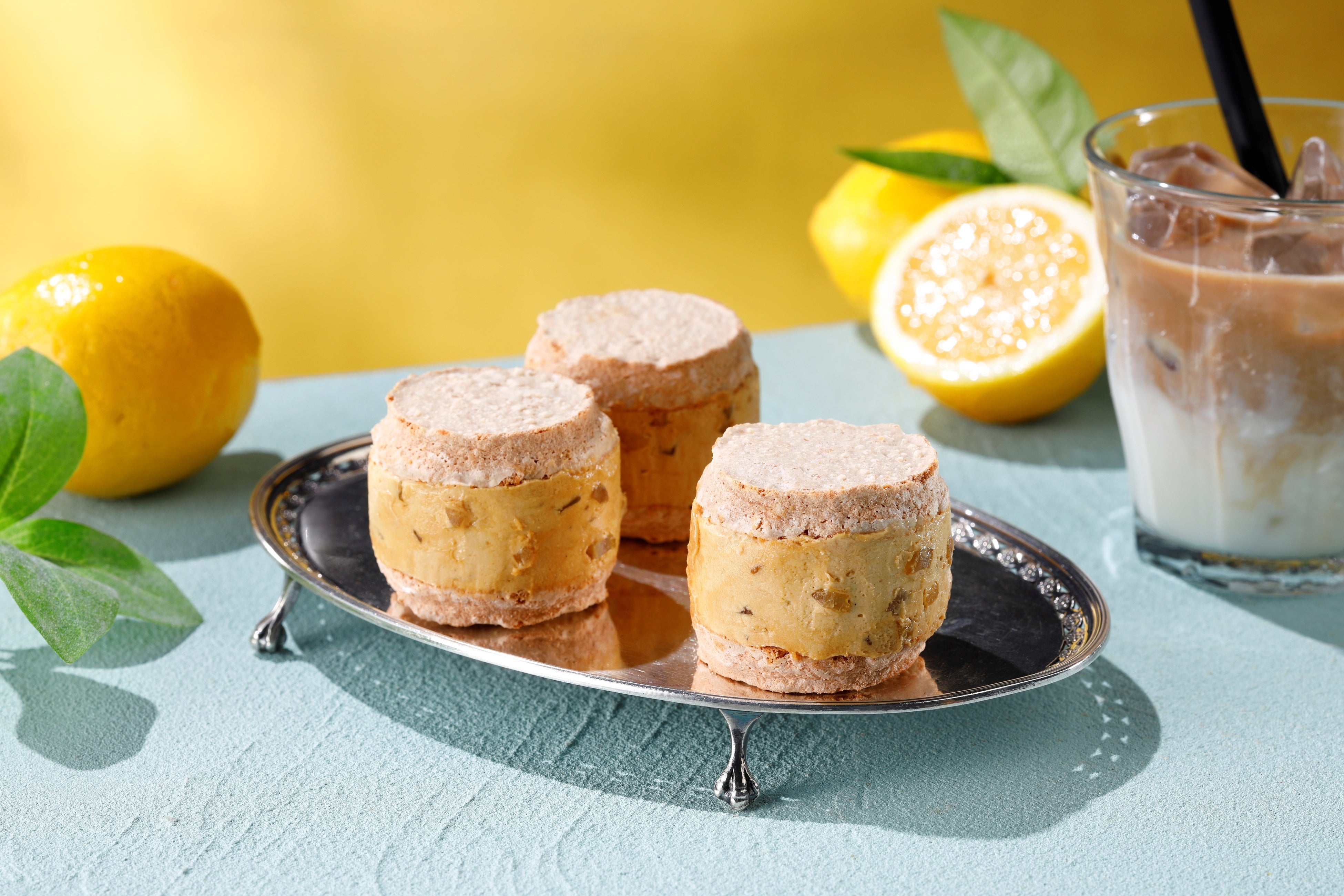 シチリアレモンペーストと瀬戸内レモンピールを練り込んだカフェラテ風味のバタークリームを、ほんのりとシナモンが香るサクサクなダックワーズ生地でサンドしました。華やかなカフェラテの香りの中に、爽やかなレモンを漂わせた夏らしいスイーツです。