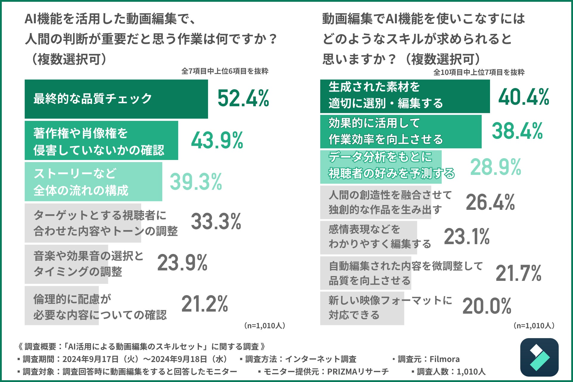そこで今回、動画編集ソフト『Filmora 14』(https://filmora.wondershare.jp/)を手がける株式会社ワンダーシェアーソフトウェアは、動画編集をする方を対象に「AI活用による動画編集のスキルセット」に関する調査を実施しました。