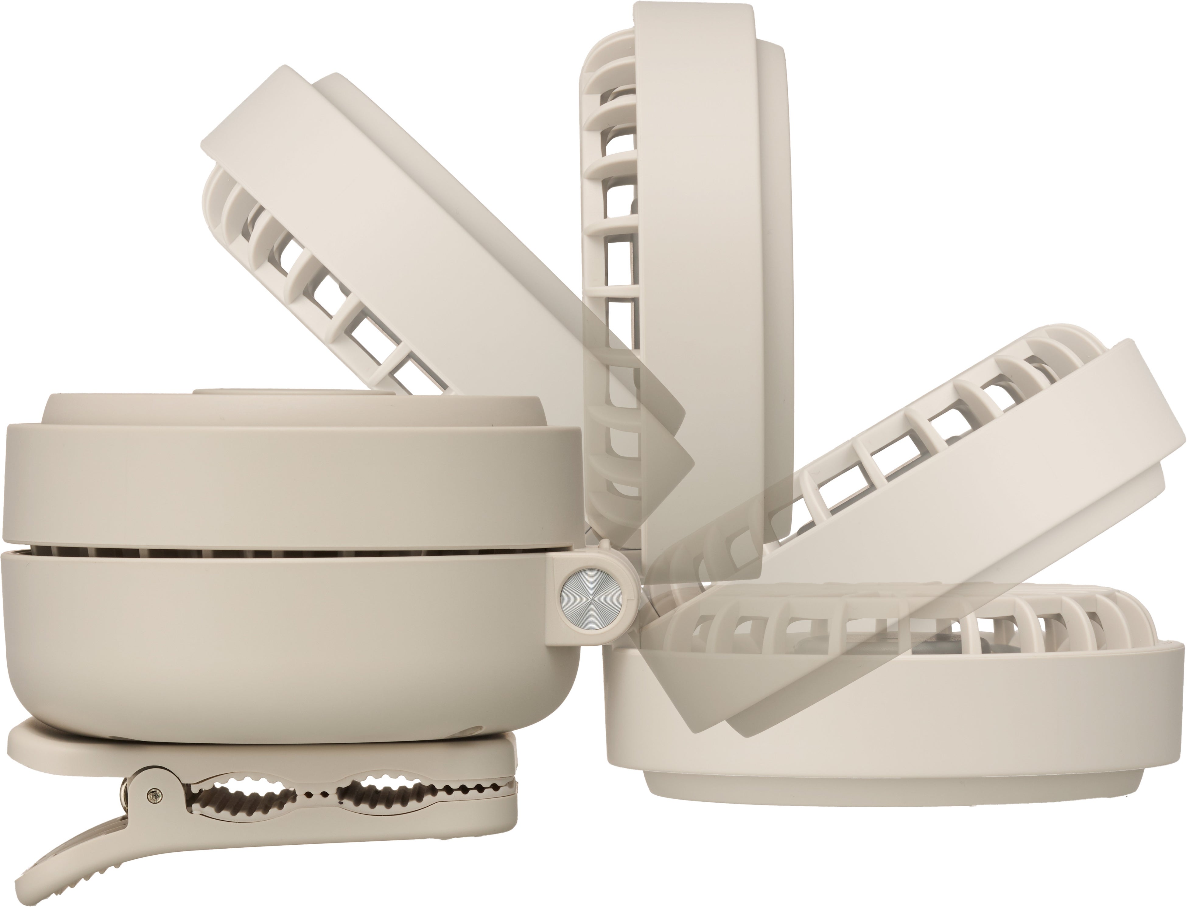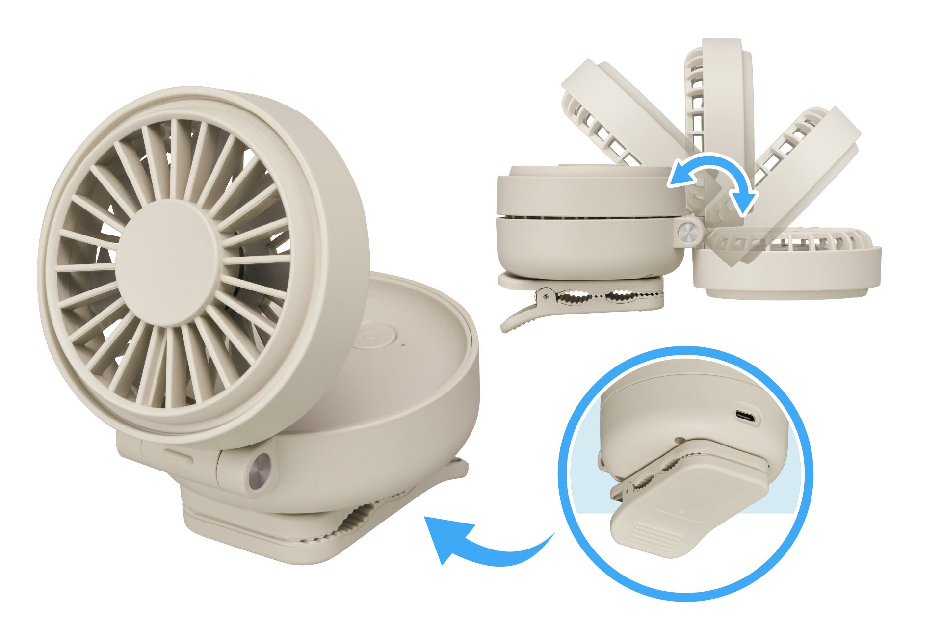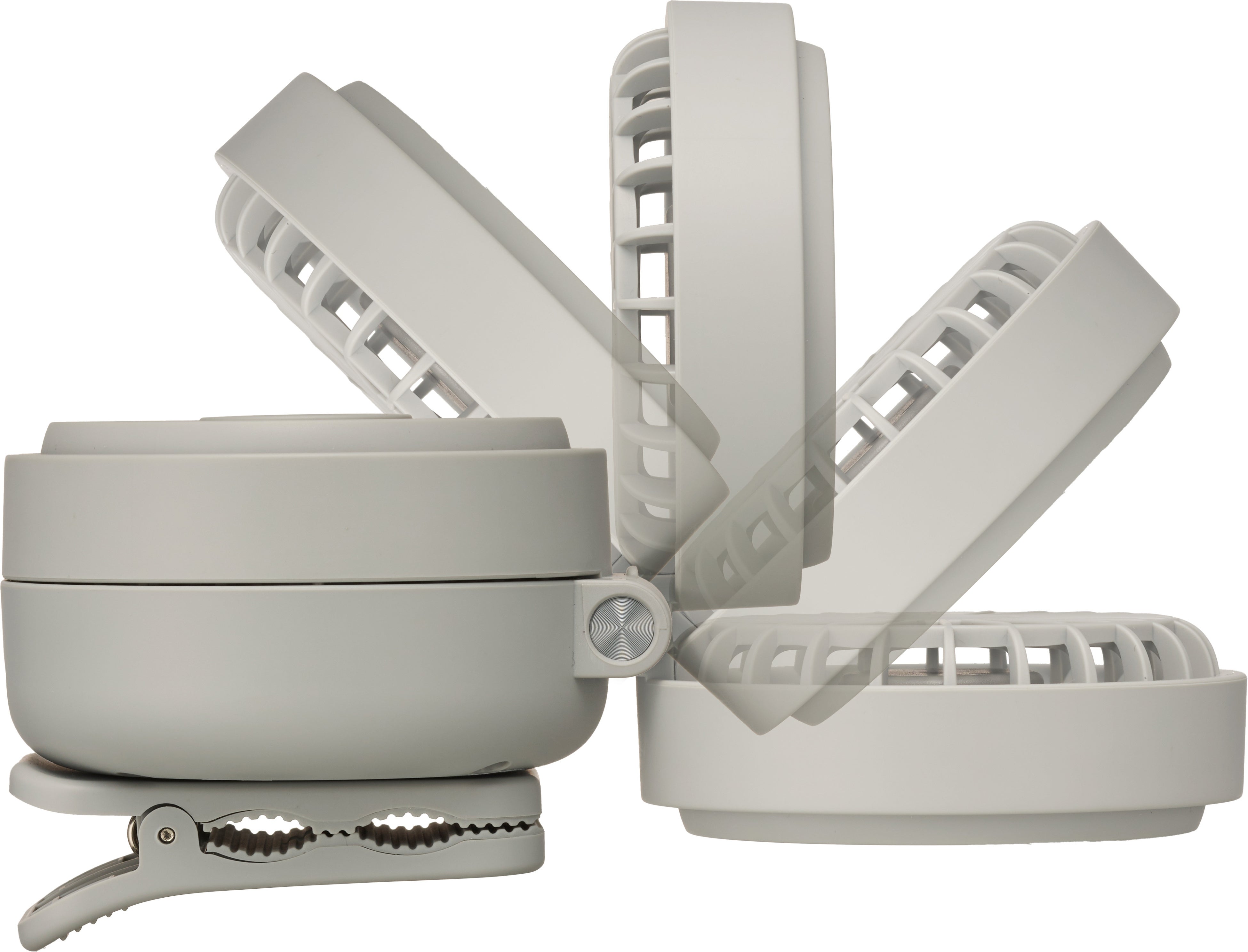 本体には水平方向に360度回転するクリップがついています。ファン部分は最大で180度開閉可能です。
