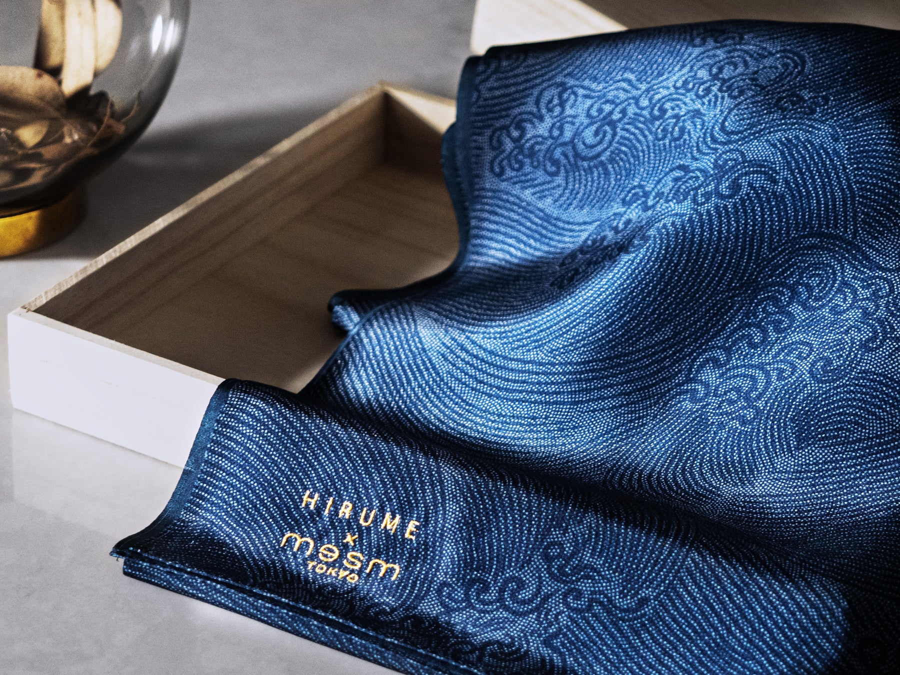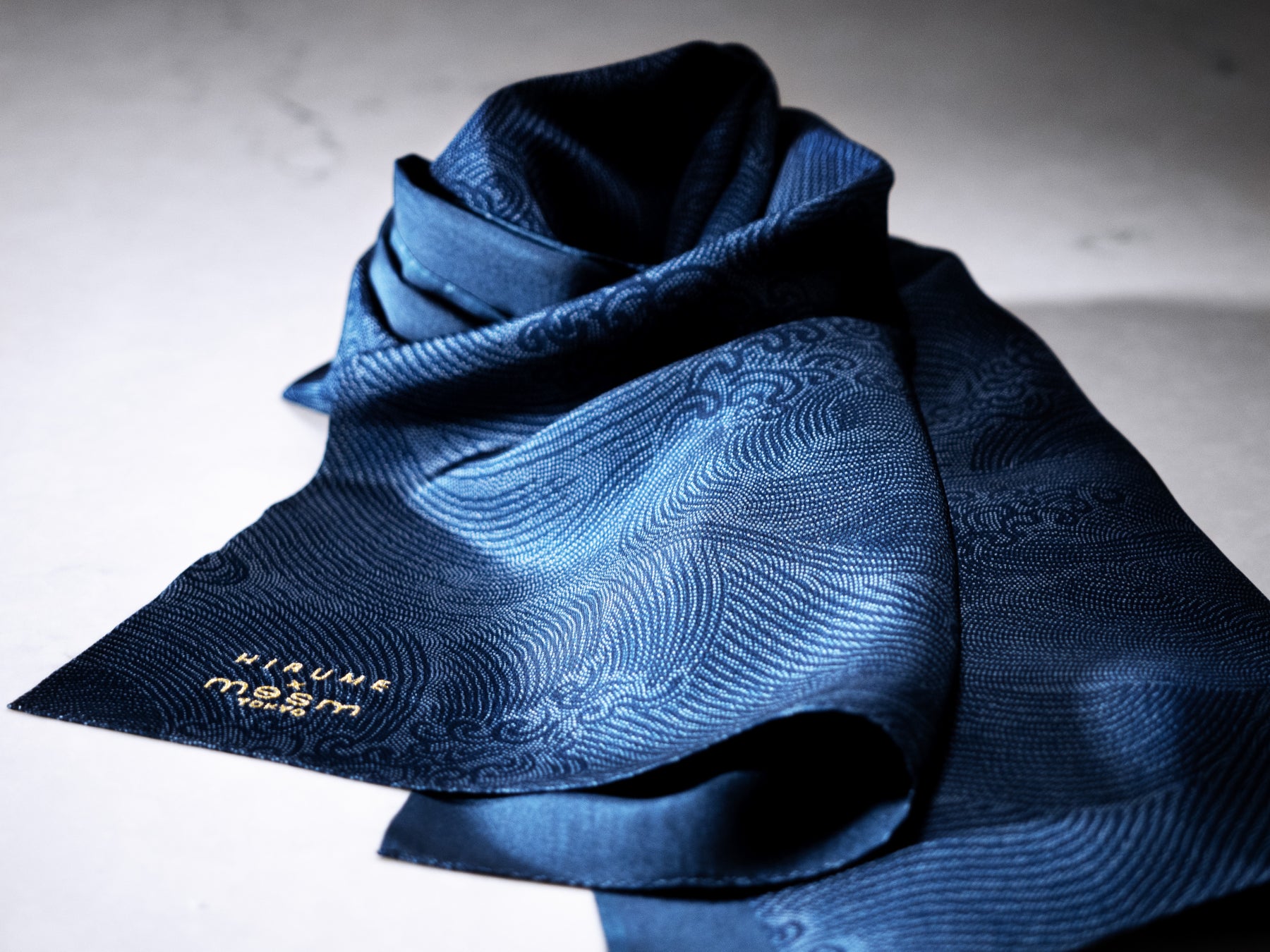 メズム東京のテーマカラー、ミッドナイトブルーに染められた100%シルクの江戸小紋スカーフは、鮫小紋に波模様をプラスして染めた特別な一品です。丁寧に金糸で刺繍された「HIRUME×mesm」のロゴが特別感を演出しています。丁寧な手仕事で仕上げられたシンプルで洗練されたデザインは、ジェンダーを問わず様々コーディネイトが可能です。数量限定の希少性のあるスペシャルアイテムとなっております。