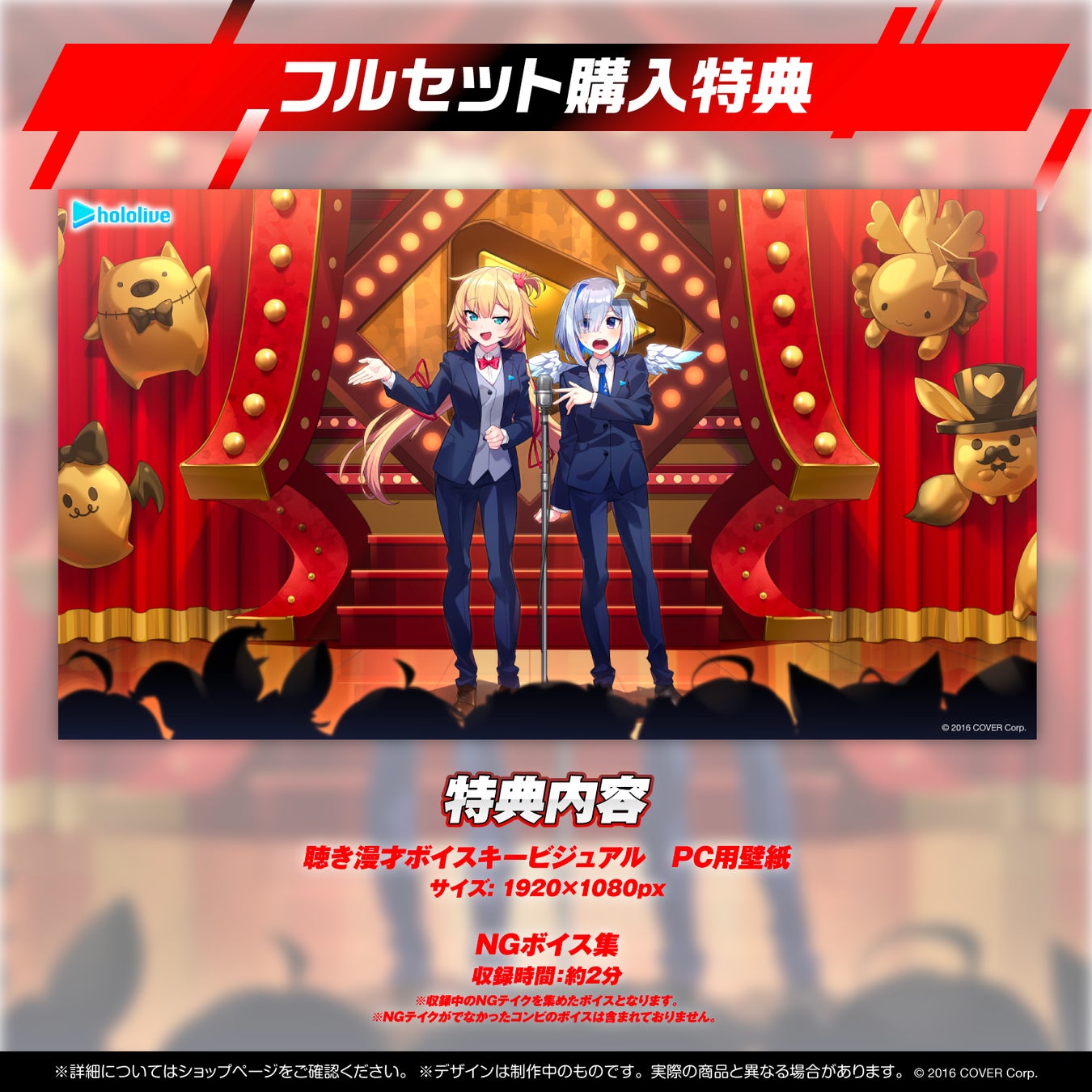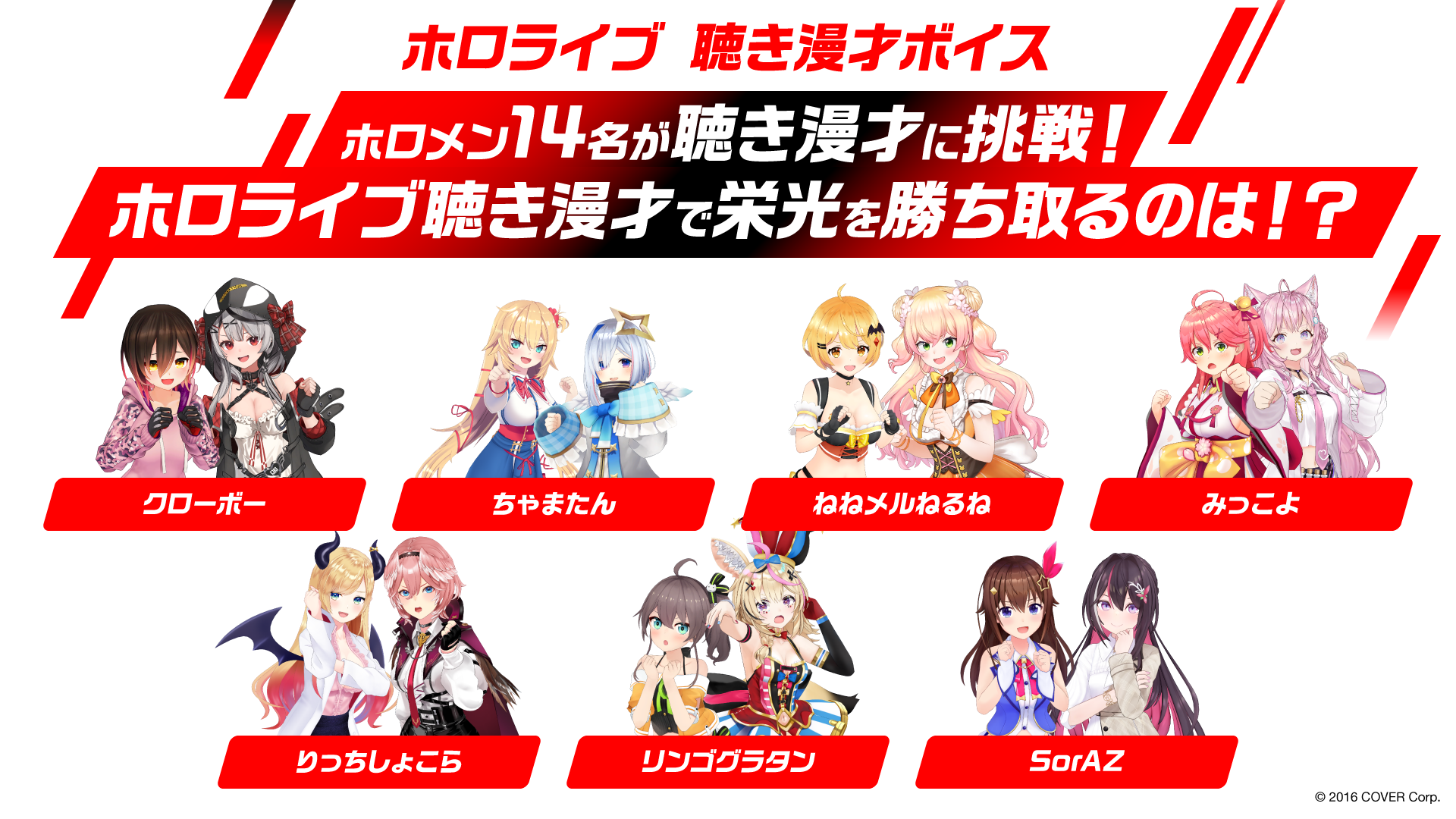 カバー株式会社(本社:東京都千代田区、代表取締役社長:谷郷元昭)は、弊社が運営する「ホロライブプロダクション」傘下の女性VTuberグループ「ホロライブ」において、「ホロライブ聴き漫才ボイス」を12月16日(金)18時より販売開始することをお知らせいたします。