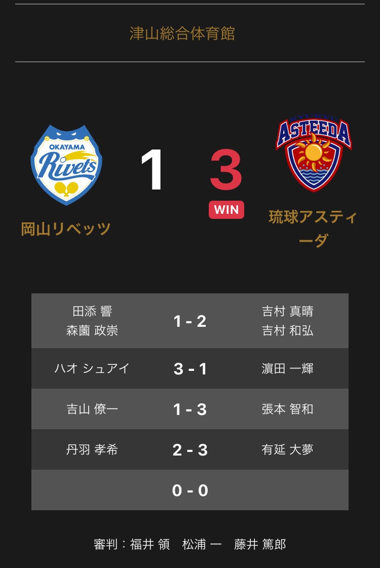 ノジマTリーグ 2022-2023シーズン 公式戦 2月23日開催 岡山リベッツ vs 琉球アスティーダは、3-1で琉球アスティーダが勝利しました。