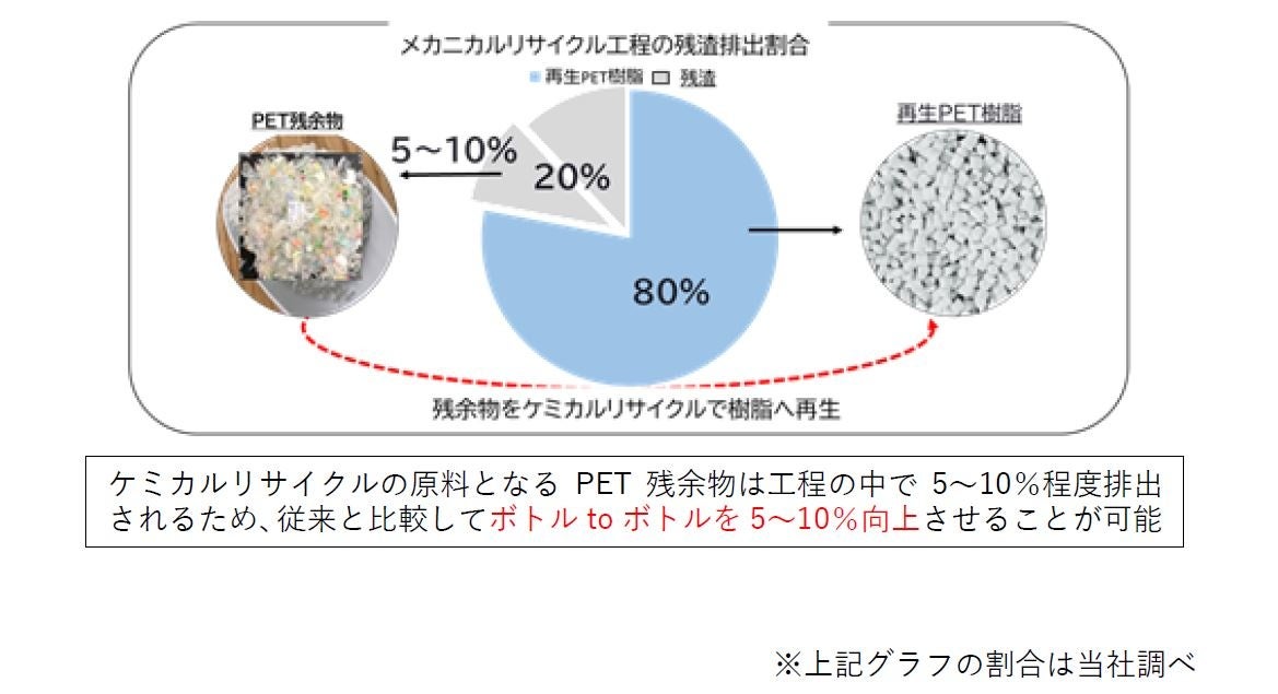 メカニカルリサイクルではリサイクルの工程で約20%の残渣が発生しますが、そのうち5~10%の残余物はペットボトル以外のものへのリサイクルが主となっています。残余物の一部にはペットボトル素材が含まれているため、残余物もペットボトル原料に再生することで、効率的かつ持続的なリサイクルが実現できます。