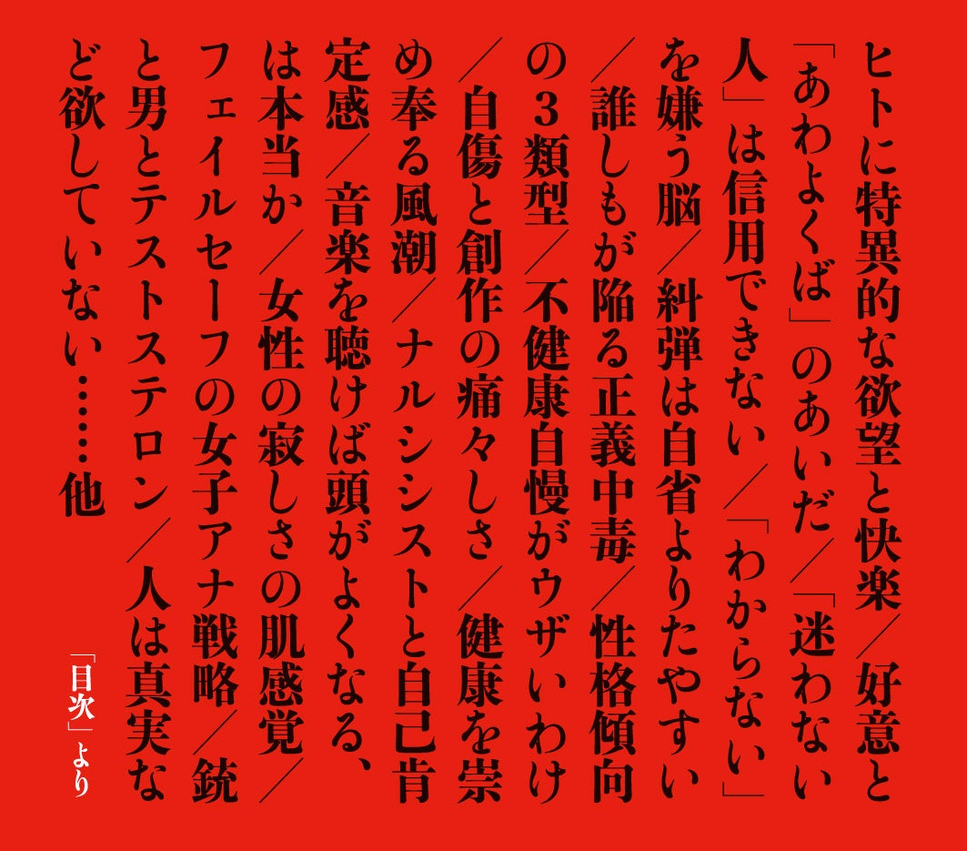 ブレない人、正しい人だと言われたい、他人に認められたい……社会集団の中で人は誰もが承認欲求と無縁ではいられない。無意識の情動に流されながら、あいまいで不安な状態を嫌い、自らを正義に置くことで他者を糾弾し安心を得たがる――現代の構造的病理を見つめながら、自身の人生と脳科学の知見を媒介に、ヒト脳に備わる深い闇を鮮やかに解き明かす。「小説新潮」連載5年にわたった思考の軌跡を一冊に凝縮。