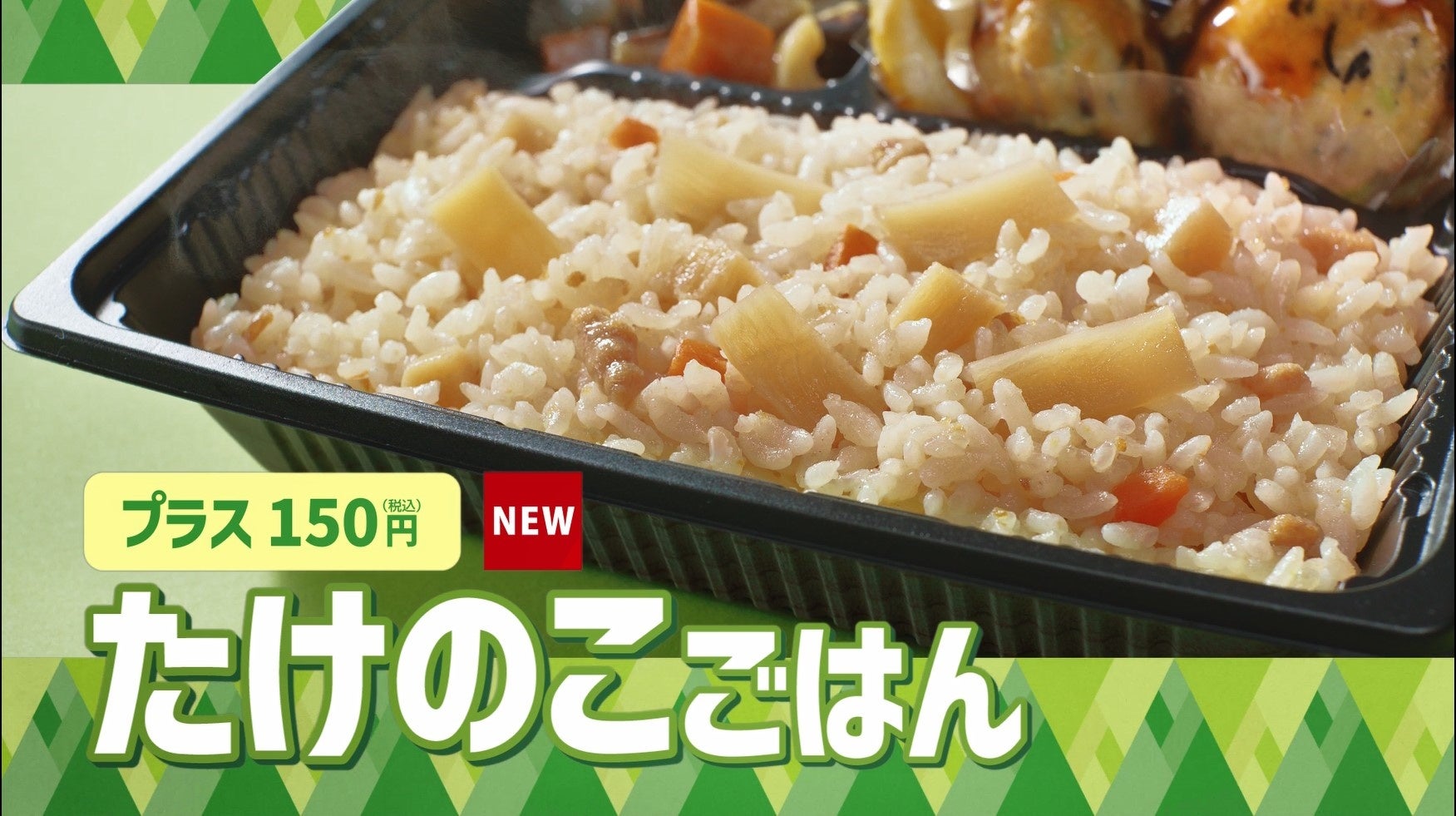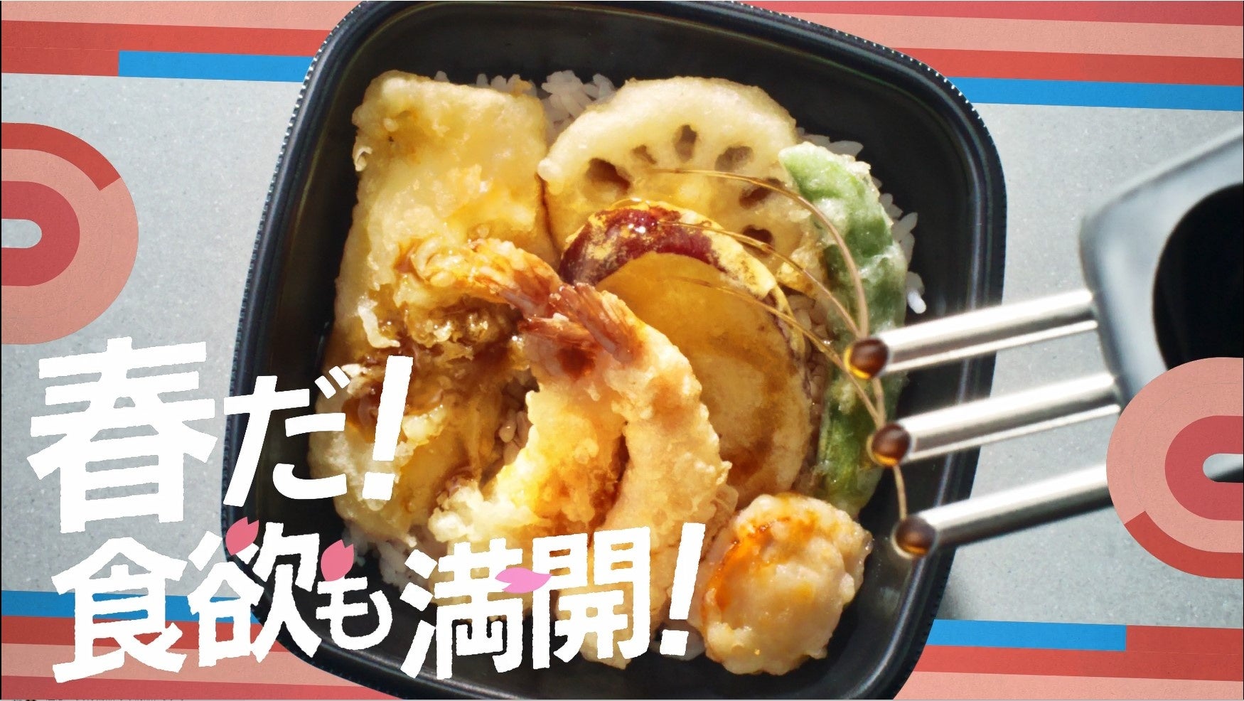 『海鮮天丼』の美味しさポイントである、海老、イカ、ホタテの3種の天ぷらを躍動感のあるシズルとアニメーションを組み合わせることで、明るく、元気に表現しました。贅沢な天丼の魅力が詰まったTVCMとなっています。また3月5日(水)より販売を開始した『たけのこごはん』も登場します。