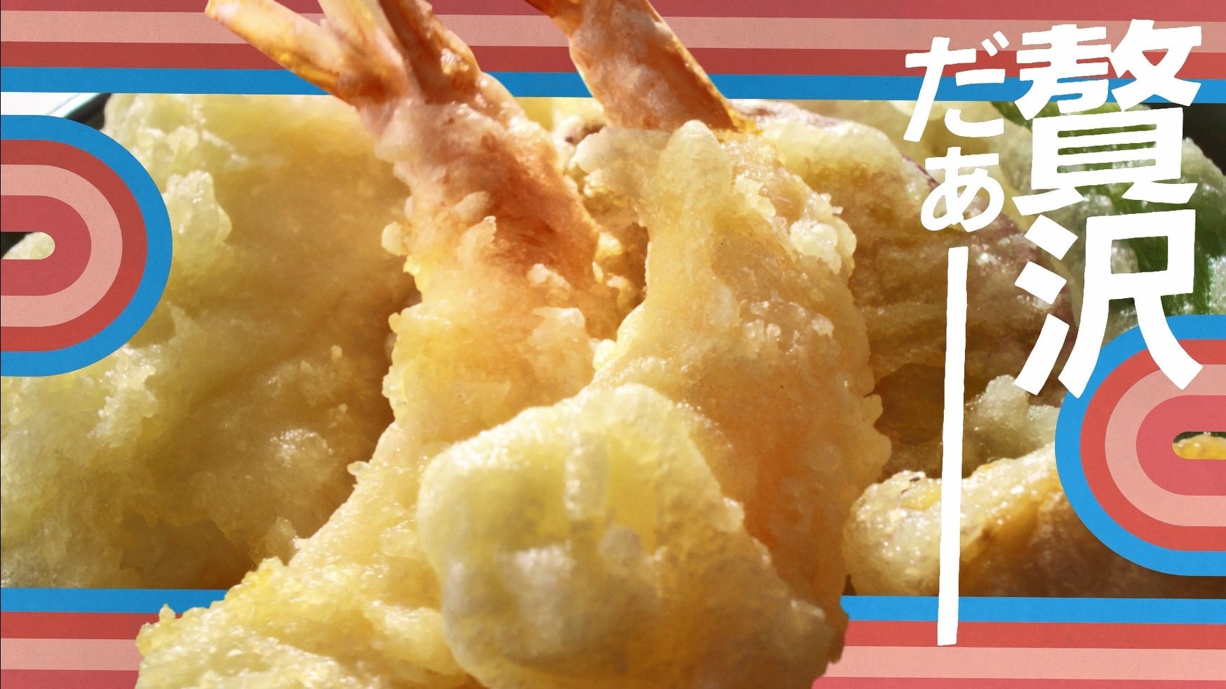 具材たっぷりの『海鮮天丼』の美味しさを躍動感のあるシズルとアニメーションを組み合わせることで、明るく、元気に表現しました。