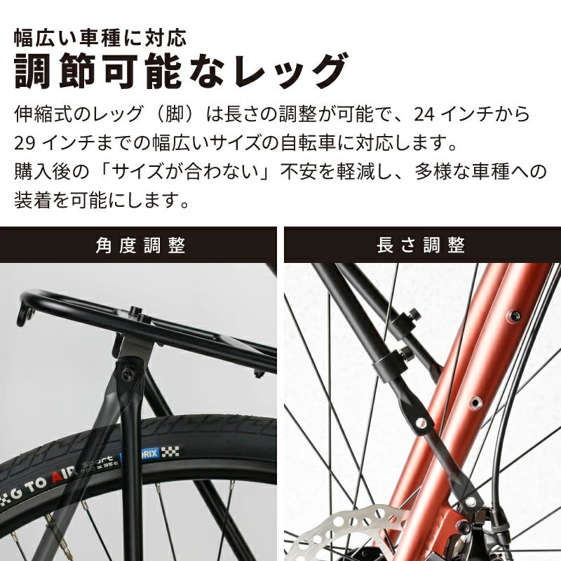 荷台寸法:長さ30cm × 幅28-15.5cm × 高さ11cm/荷台固定幅:20~28cm/荷台角度:約100° /フォークセンターブラケット(幅16mm × 全長153mm)/伸縮式レッグ(長さ280~390mm / φ10mm, φ13.5mm)/ 固定ベルト:長さ49~88cm(調整可能) × 幅2cm(ナイロン製)