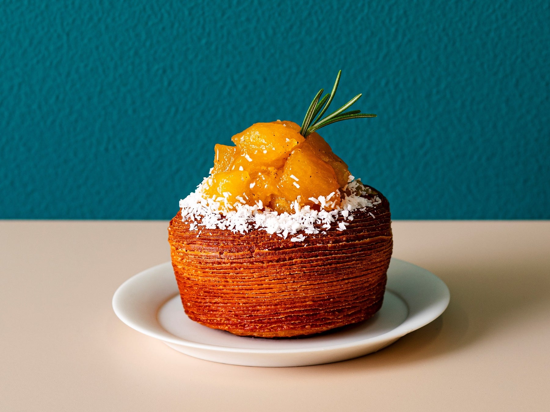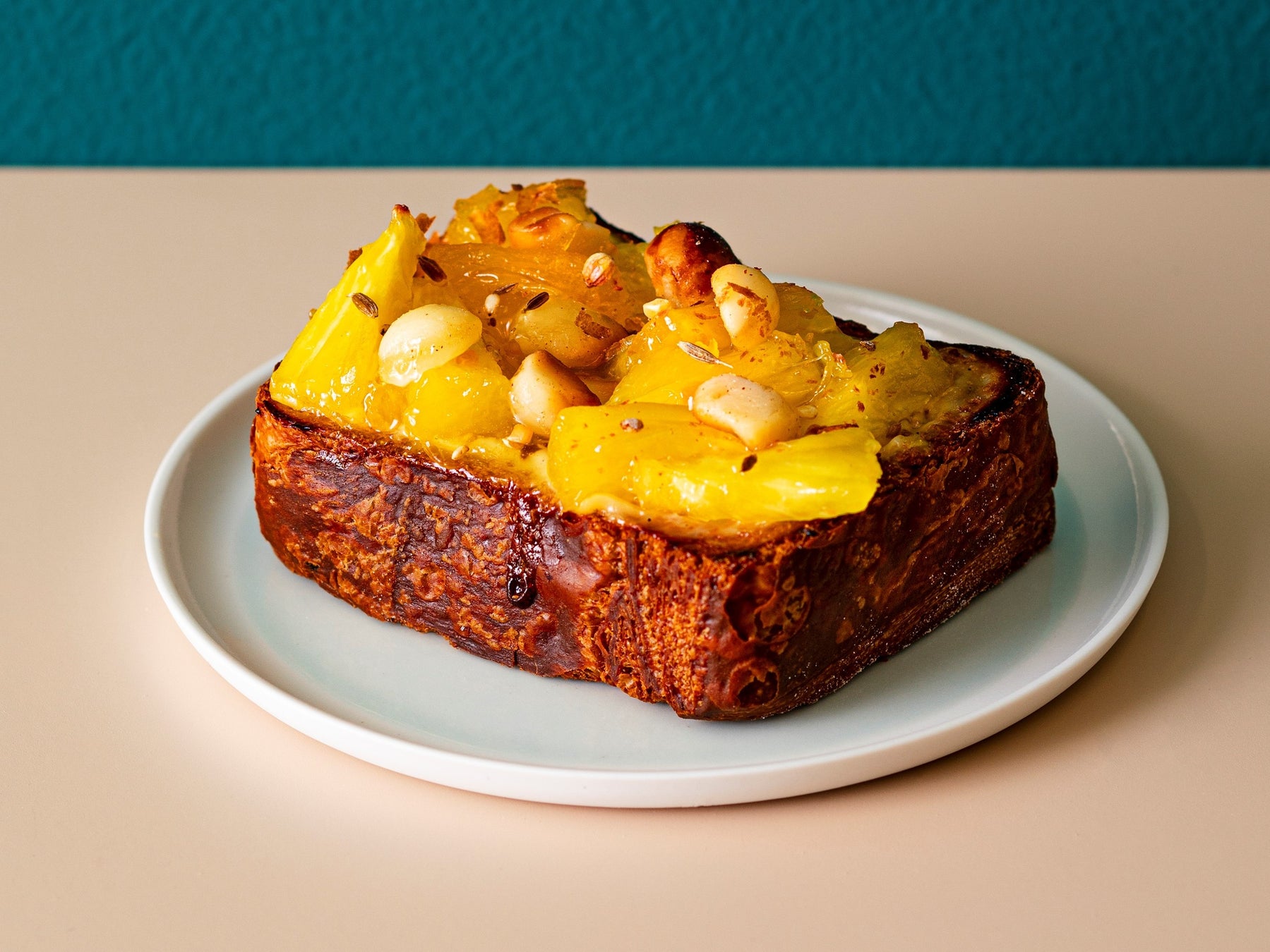 デニッシュブレッドにカスタードクリームを塗り、完熟パインをどっさりのせて焼き上げました。サクサクなパンとカスタードのクリーミーさ、パインのシャキッと食感がマッチした一品。爽やかな香りのアニスシードやスパイシーなカルダモンも使われ、奥深い味わいはワインとも好相性です。※数量限定:1日50個