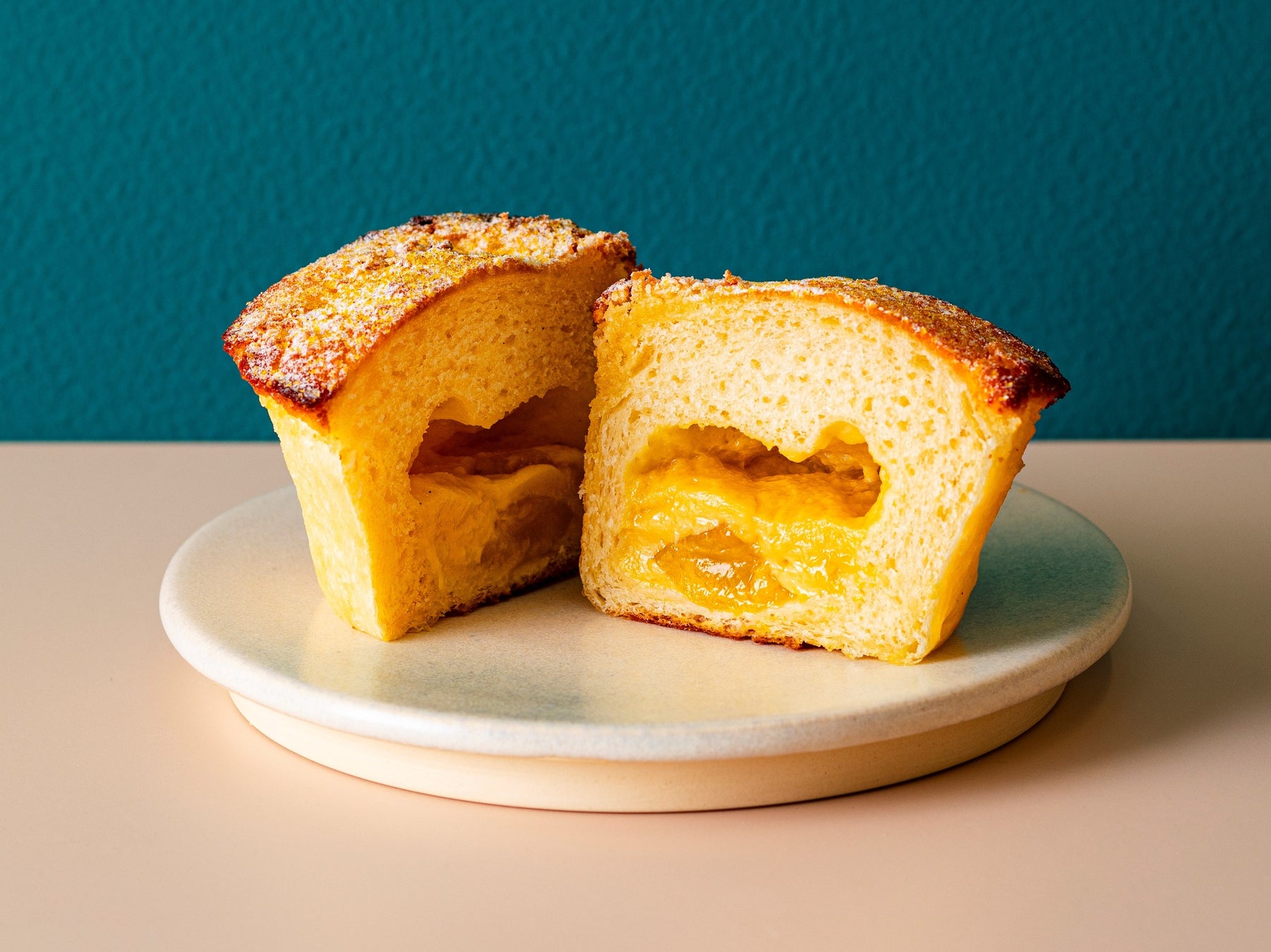 たっぷりのバターを使用したブリオッシュ生地に、パッションフルーツの爽やかなクリーム、ごろっとしたパイナップルとマンゴーの果実とマンゴーカスタードクリームを包んで焼き上げました。表面にはアーモンドクリームをかけて、クッキーのようなサクッとした食感とふわふわの生地をお楽しみいただけます。夏限定のデザートパンです。 ※数量限定:1日30個