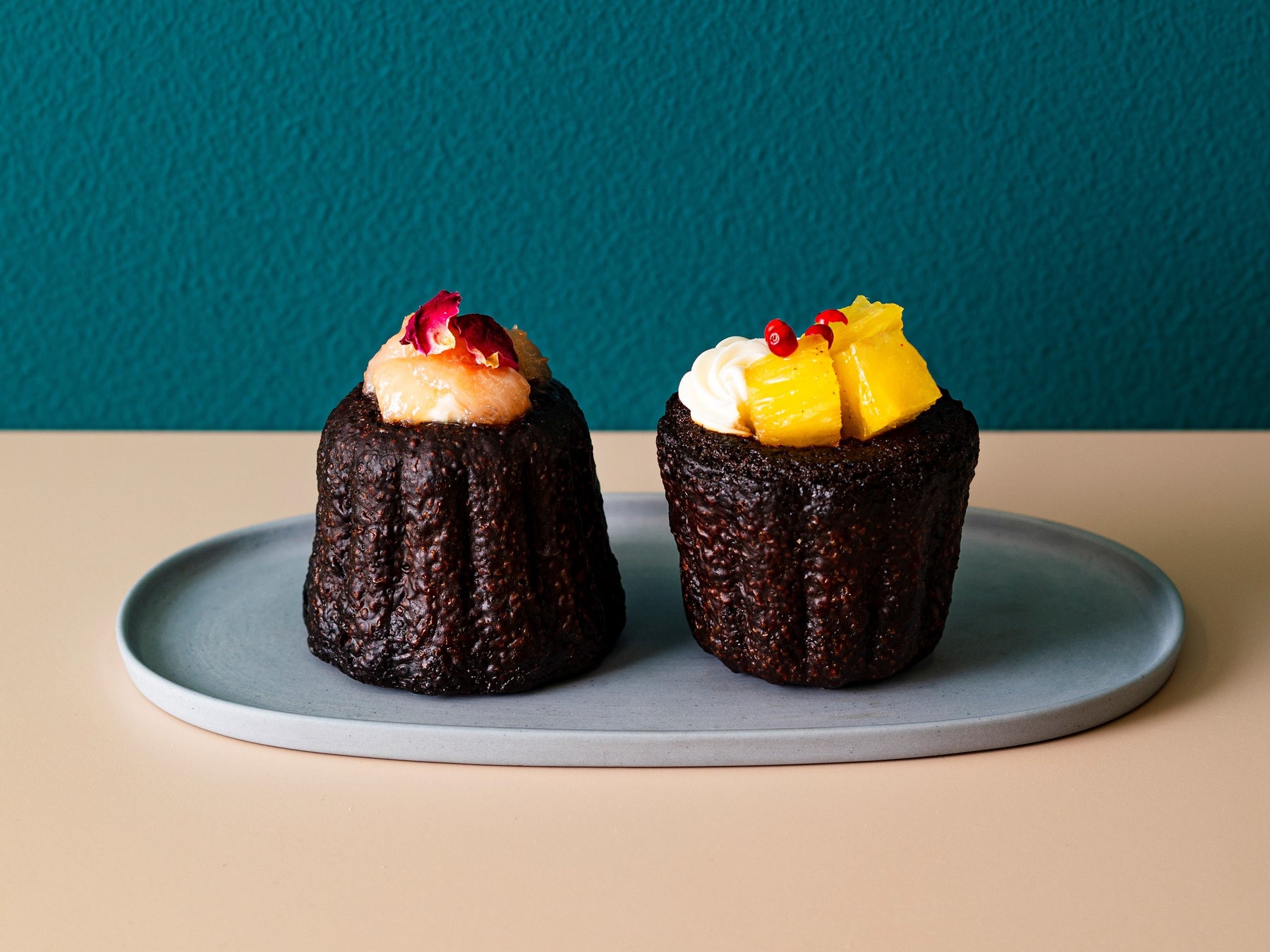 軽井沢のカヌレ専門店から、夏限定フレーバーの「桃」(左)と「パイン」(右)のセットです。「桃」は、旬でおいしい芳醇な果実にクリームチーズの風味がぴったり。「パイン」は、食感を残しながらソテーして甘さを引き出したパイナップルに、ピンクペッパーの爽やかな香りがアクセントです。外はサクサク、中はなめらかなカヌレと、旬のフルーツのおいしい出会いをお楽しみください。※数量限定:1日30個