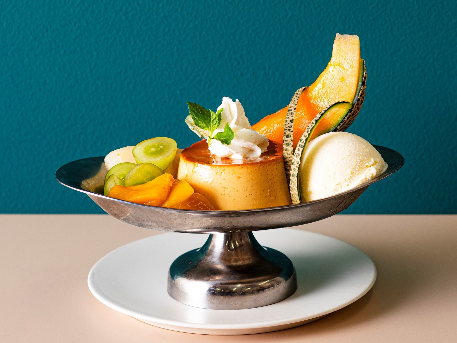 クラシックな器で、写真映え必至なプリンアラモード!昔ながらの固め食感なプリンに、アイスクリーム、桃・マンゴー・メロン・マスカットなど夏の果実が満載。カラメルのほろ苦さにフルーツのジューシーな甘さ、バニラアイスの濃厚さをお楽しみください。