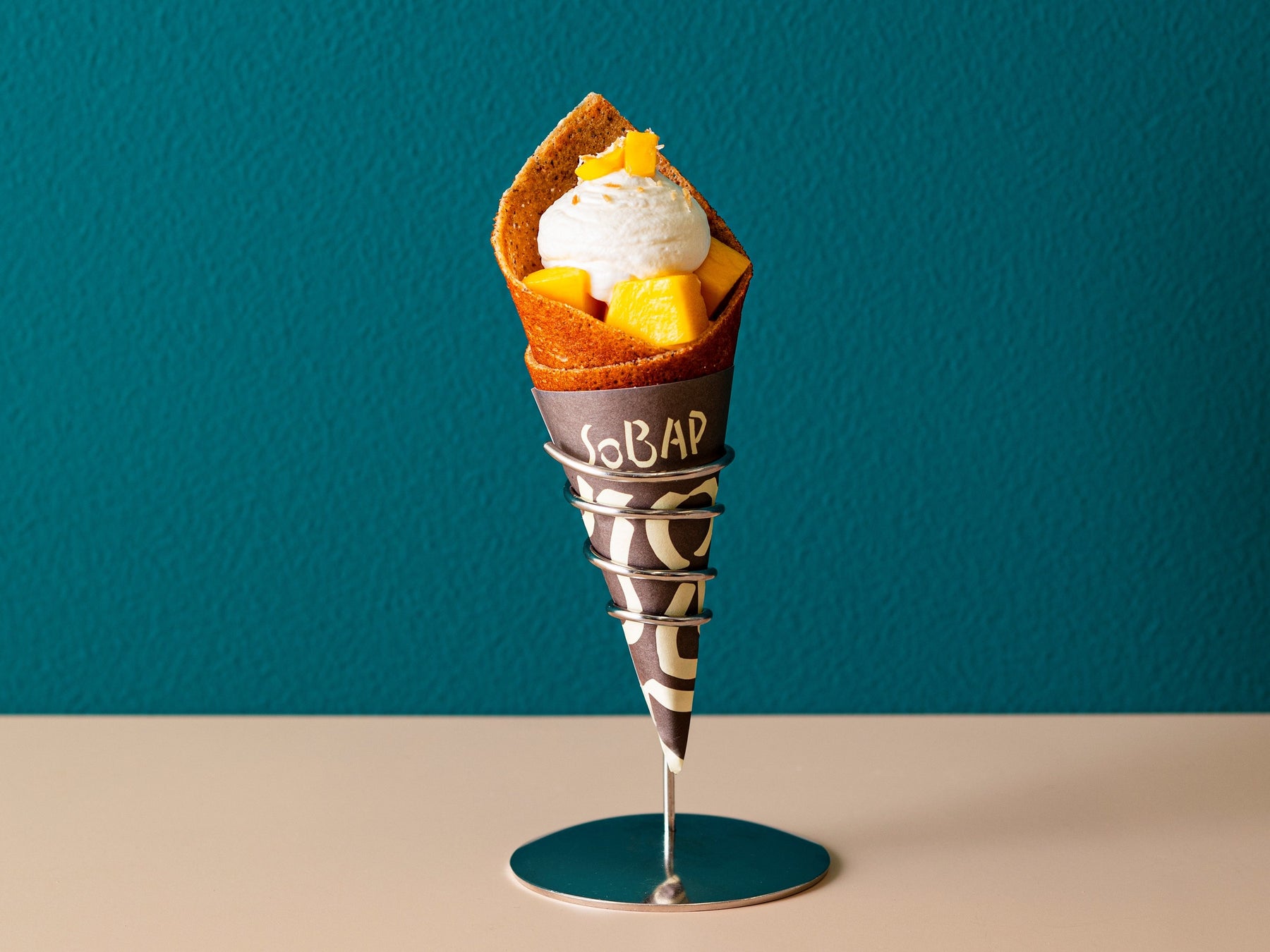 アップルマンゴーの濃厚なおいしさを包み込んだ、新感覚のそば粉ミニクレープです。甘みと香りが強く、とろける食感の完熟アップルマンゴーに、純生クリームをココナッツミルクとホイップしてコクをプラスしました。さらにその下には、自家製カスタードクリームに甘酸っぱいマンゴーソースをたっぷり注ぎ、マンゴープリンのような味わいも楽しめます。