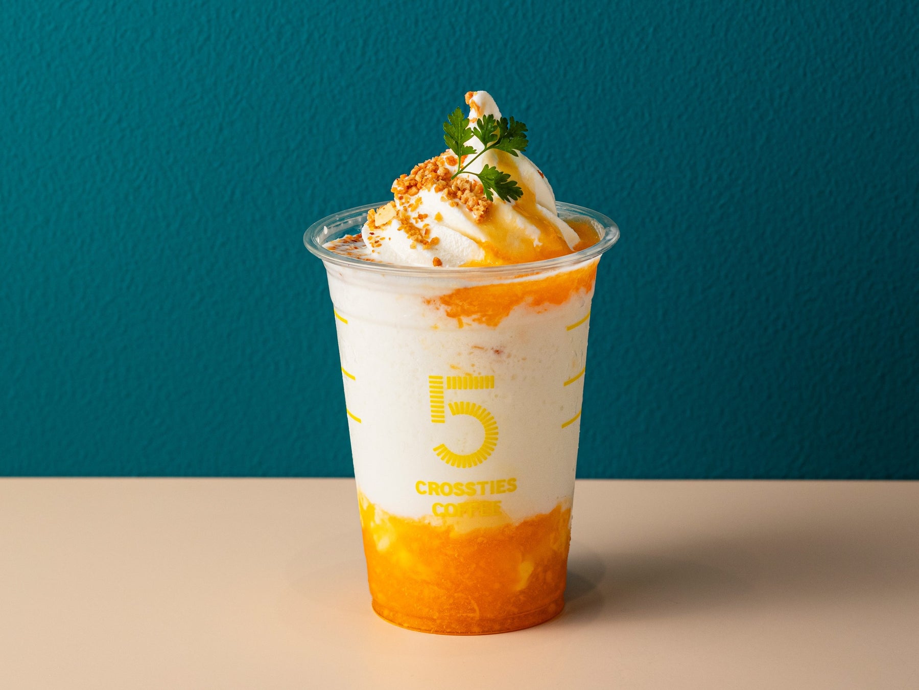 果肉をふんだんに使った自家製マンゴーソースに、ヨーグルトフラッペとマンゴープリンをミックスしたドリンクを加え、まるでマンゴーラッシーのような味わいです。上にはソフトクリームをトッピングし、パフェのような満足感のあるドリンク。かき混ぜて味の変化も楽しめます。