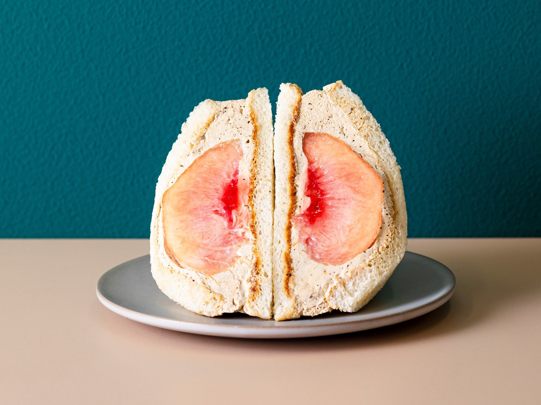 サンドイッチ専門店の夏の新作サンドイッチは、2種の桃を使用。ジューシーで柔らかな食感の清水白桃と、しっかりとした果肉と濃厚な甘さが特徴の黄桃の両方を堪能できます。サワークリームを加えた特製クリームがさっぱりとしていて、夏にぴったりのテイストです。