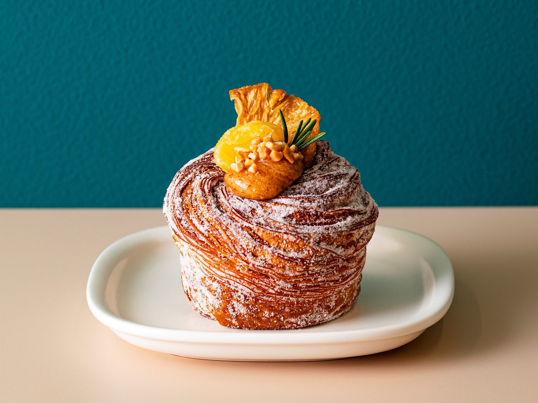 クロワッサンとマフィンを組み合わせ、外はサクサク、中はふんわりの新食感が特徴の「クラフィン」。パンの中には、爽やかなパイナップルクリームとコンフィチュール、上にはアーモンドクリームと2種類のドライパイナップルをのせました。甘みと酸味のバランスが抜群です。