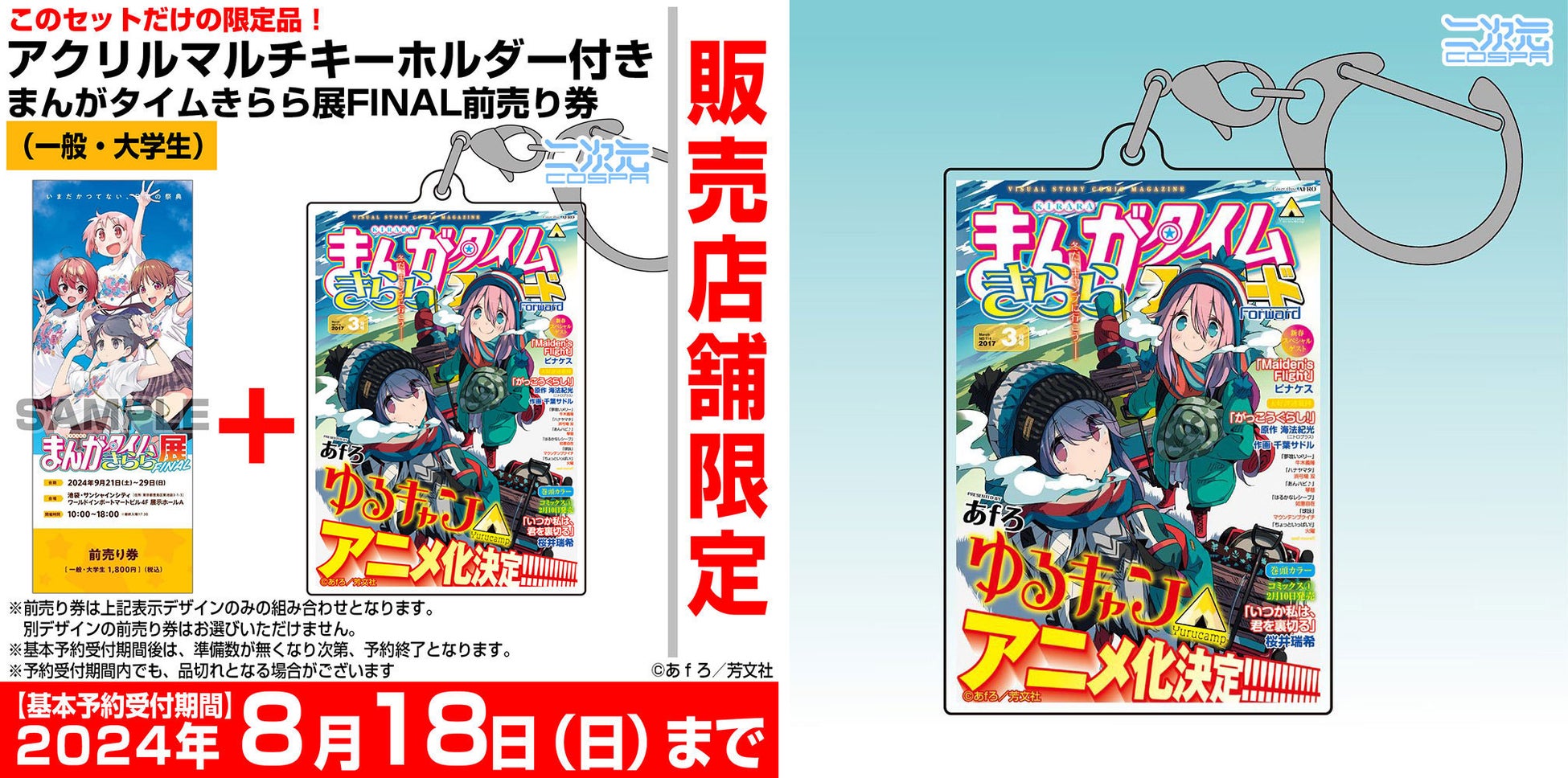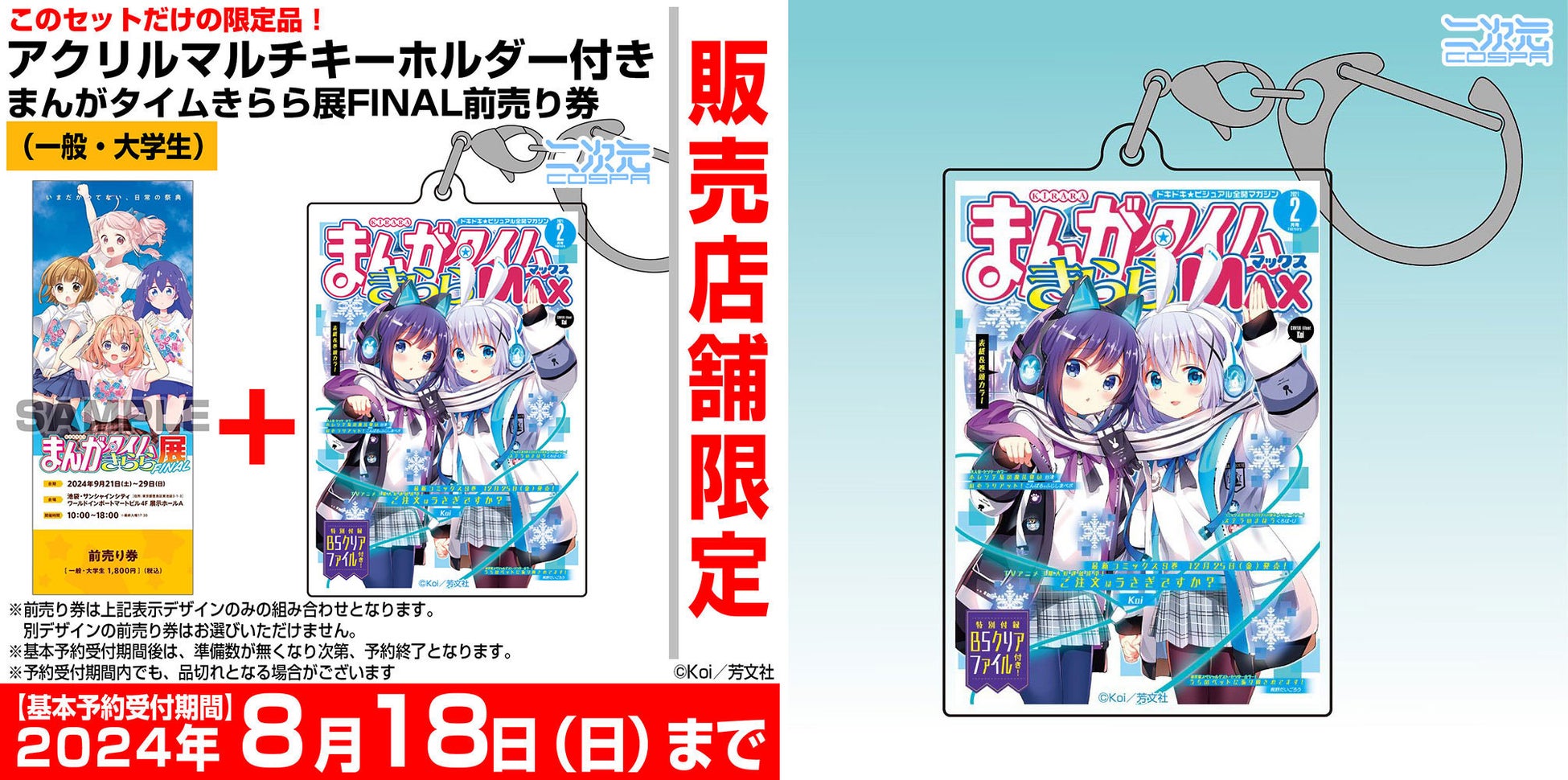 2024年9月21日(土)から池袋・サンシャインシティで開催される〈まんがタイムきらら展FINAL〉を記念して、COSPA(コスパ)/GEE!STORE(ジーストア)での予約でしか手に入らない「アクリルマルチキーホルダー付き前売り券」が二次元コスパより登場です。