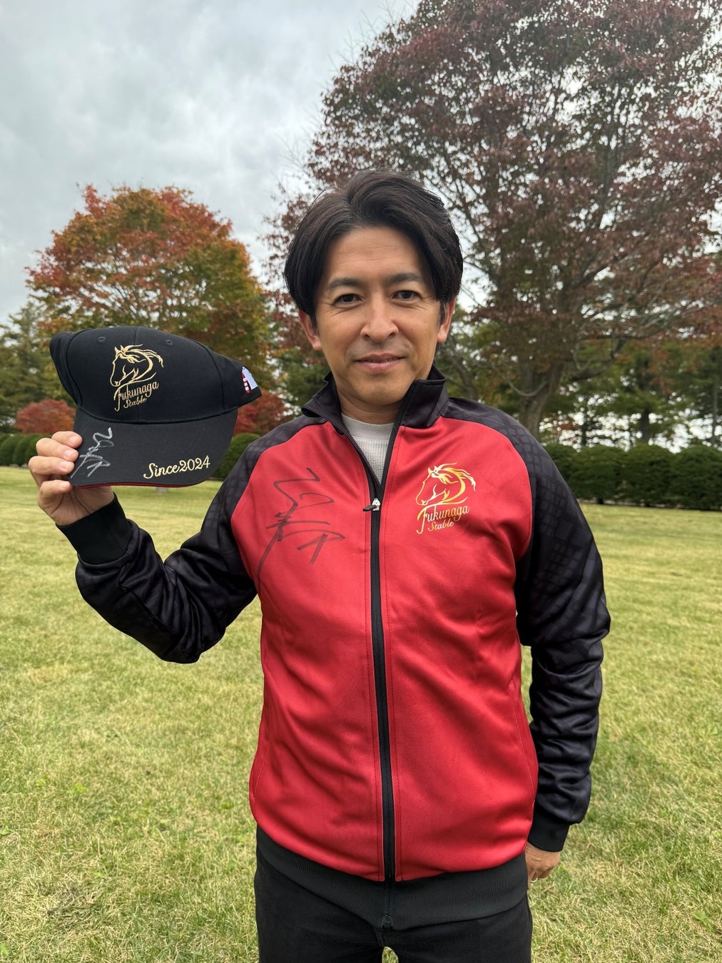 右:福永祐一調教師 サイン入り 福永祐一きゅう舎スタッフブルゾン&キャップ(No.4)