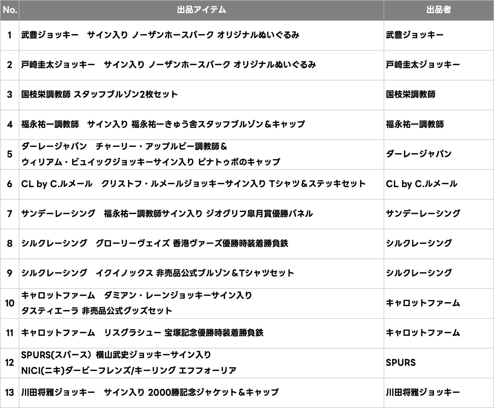 引退競走馬の幸せな未来のために、JRA所属の人気ジョッキーや名馬の貴重なアイテムを多数出品